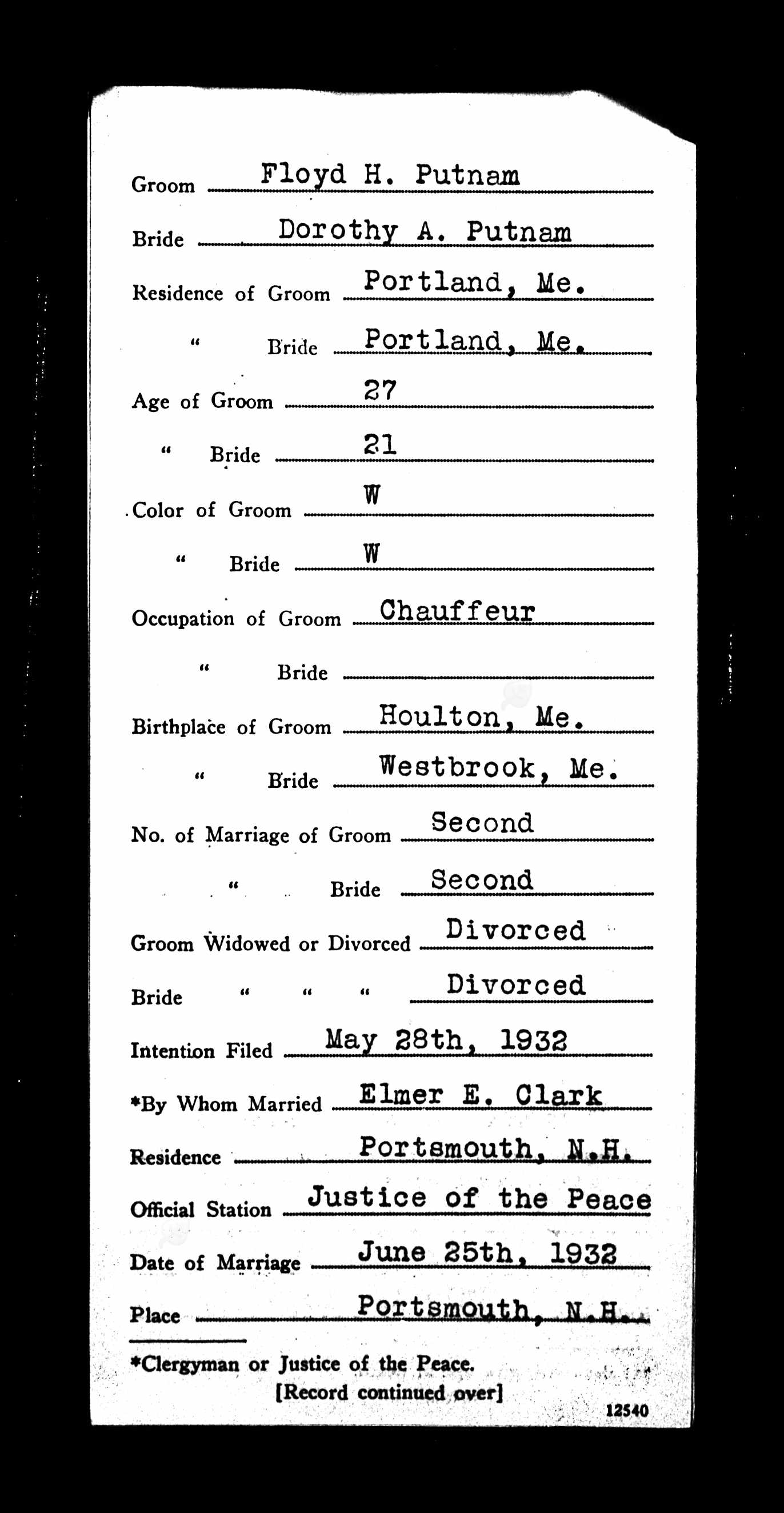 | Married | Husband | Putnam, Floyd H. ( * 17 Apr 1905 + 9 Apr 1984 ) | |||||||||||||||||||||||||||||