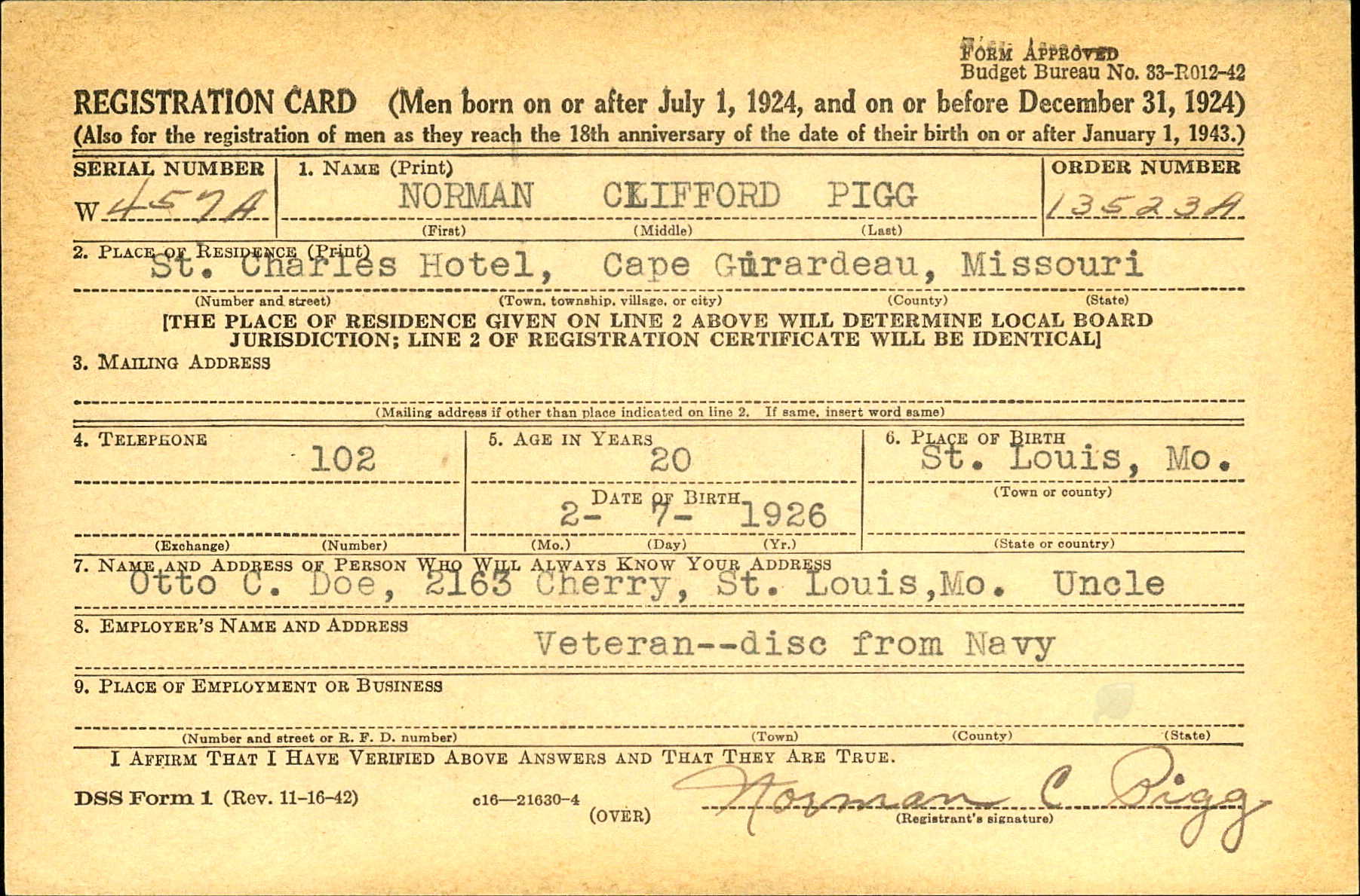 WWII Draft Registration, Norman Clifford Pigg