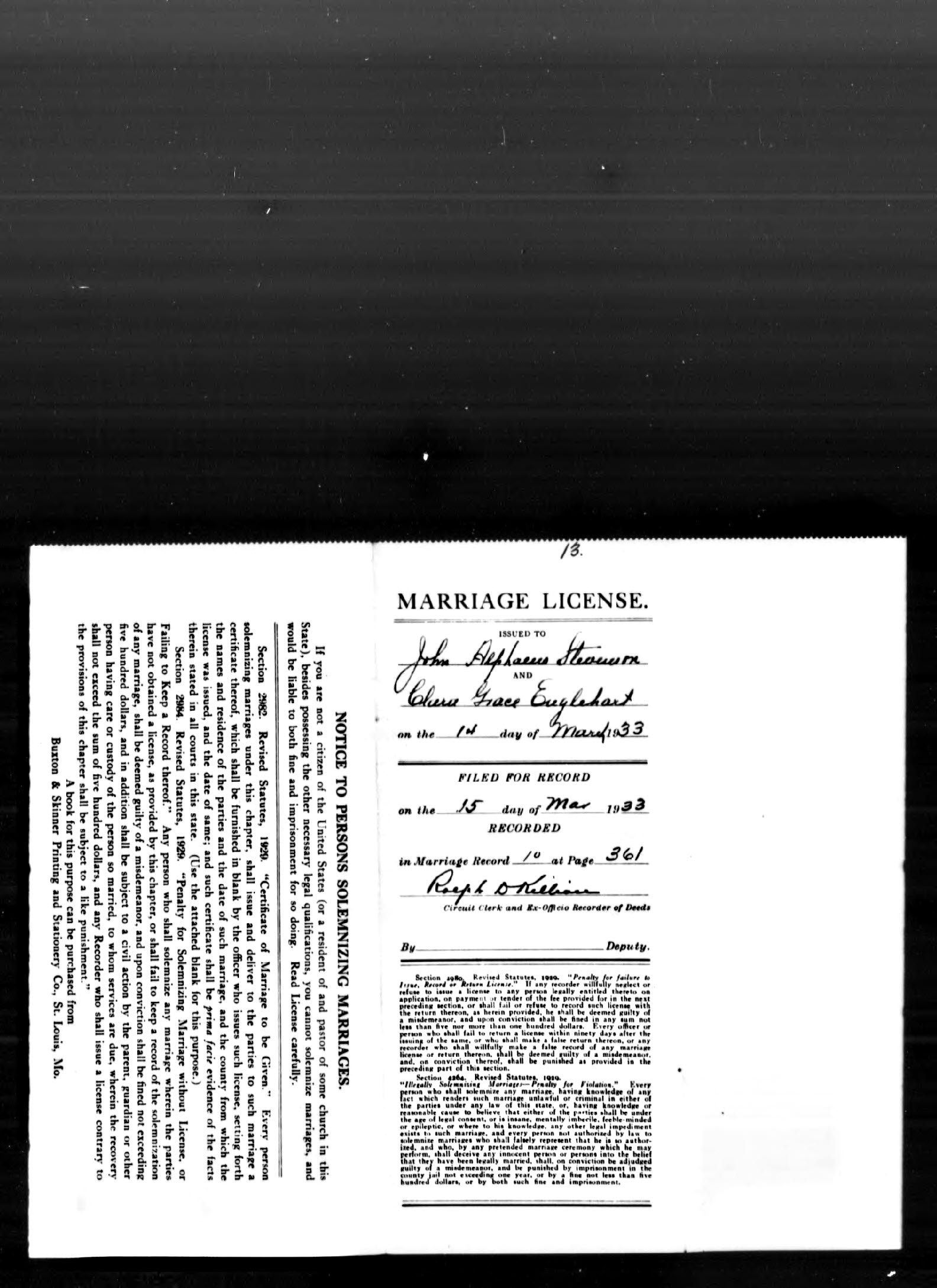 Missouri Marriage Record, John Alphaeus Stevenson and Clara Grace Englehart