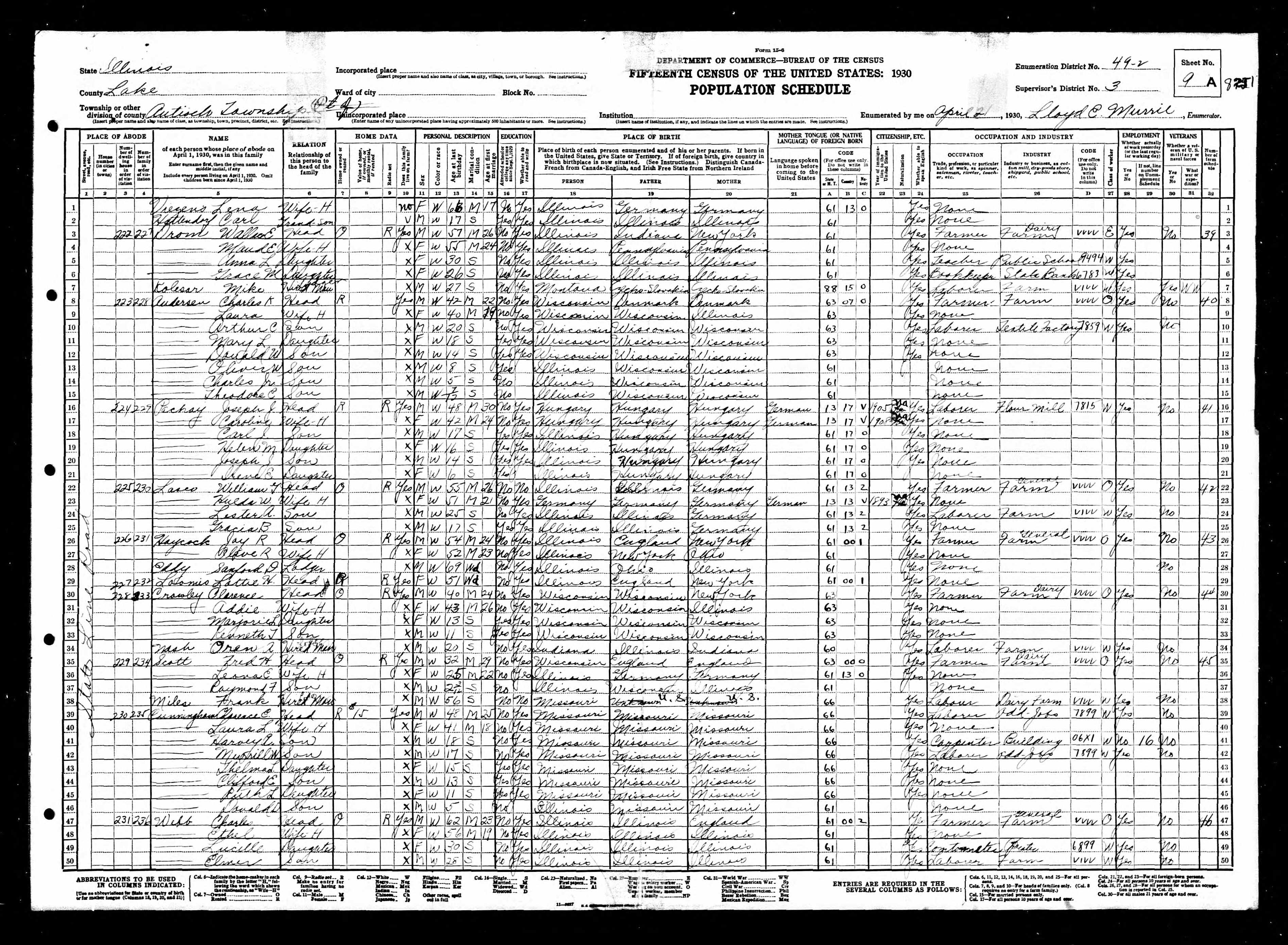 Illinois, Enumeration District 49-2, Supervisor's District 3, Sheet 9A, Lines 39-46
