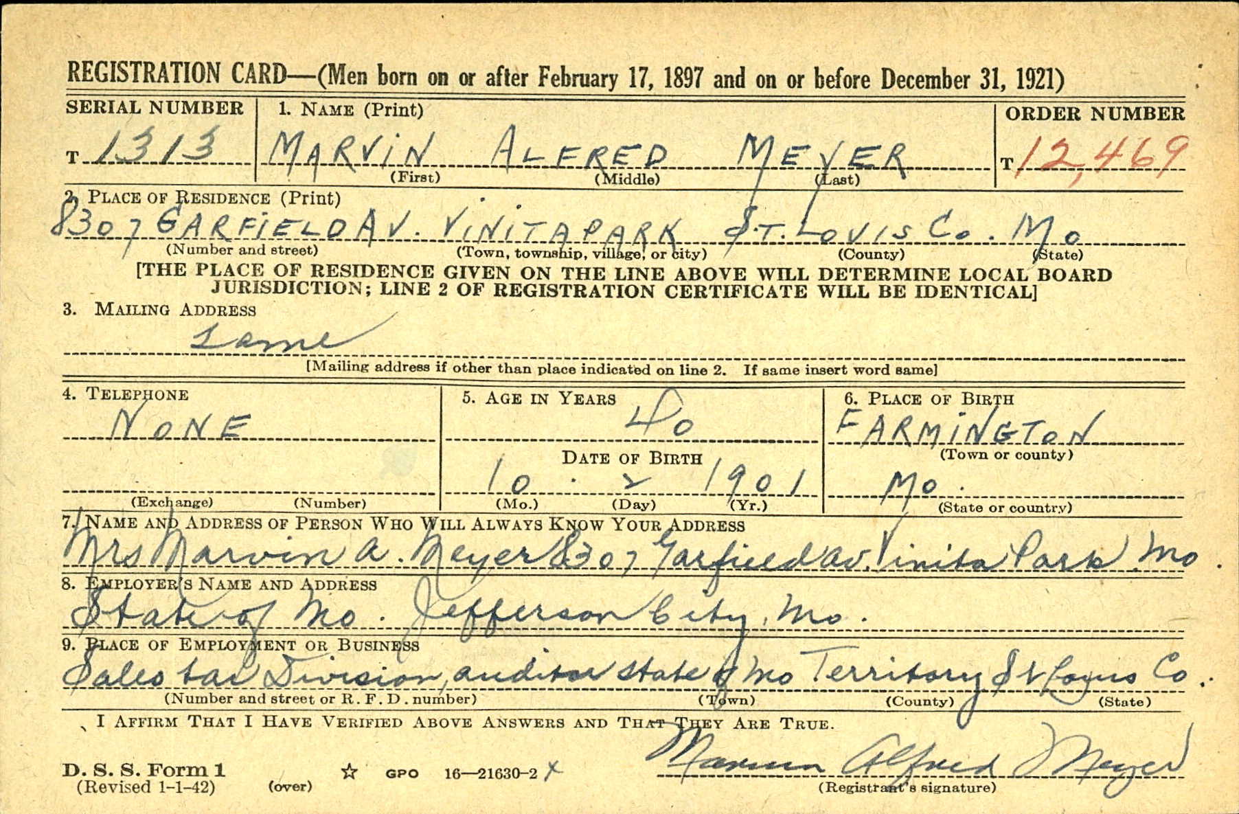 WWII Draft Registration, Marvin Alfred Meyer