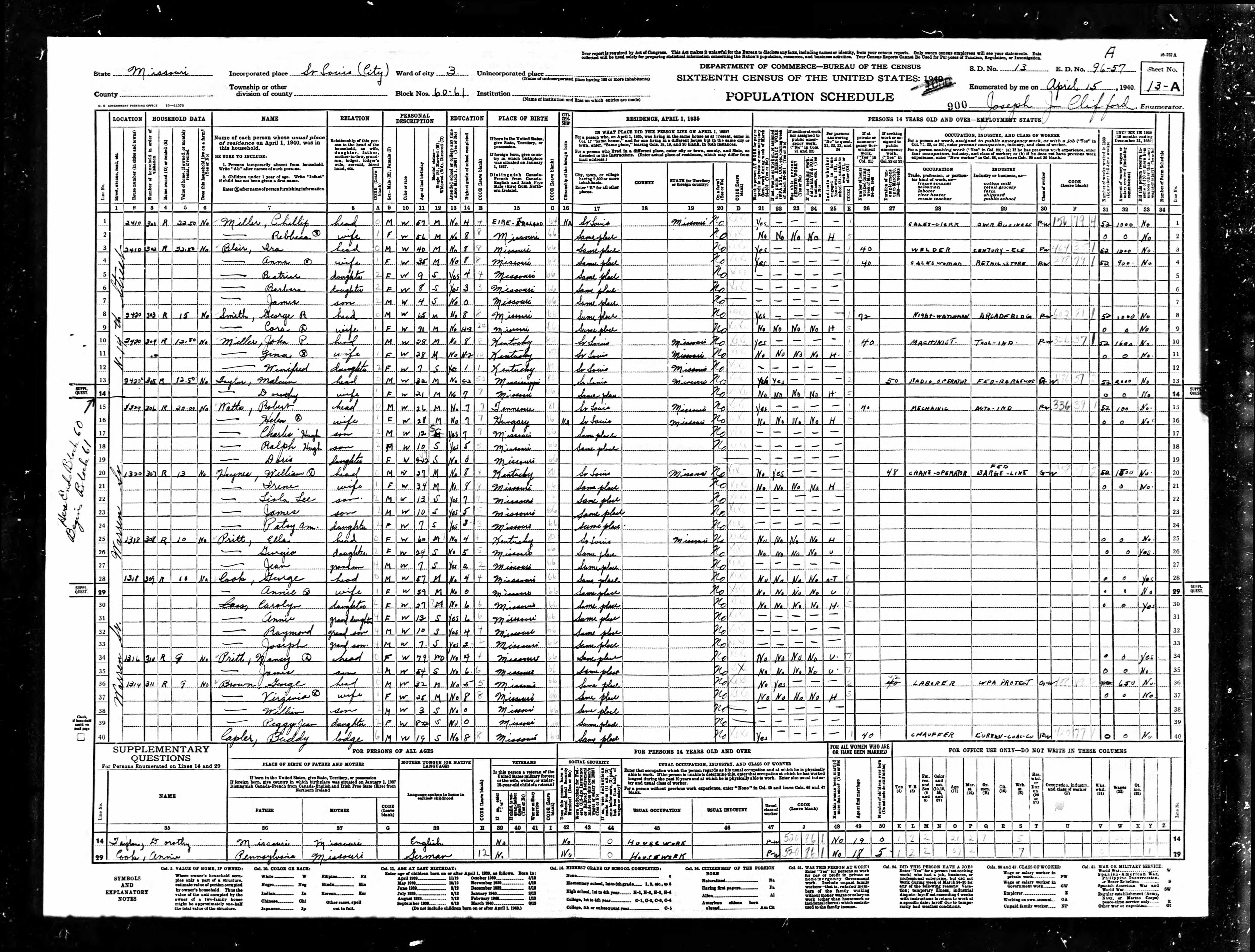 Missouri, S.D. 13, E.D. 96-57A, Ward 3, Sheet 13A, Lines 3-7