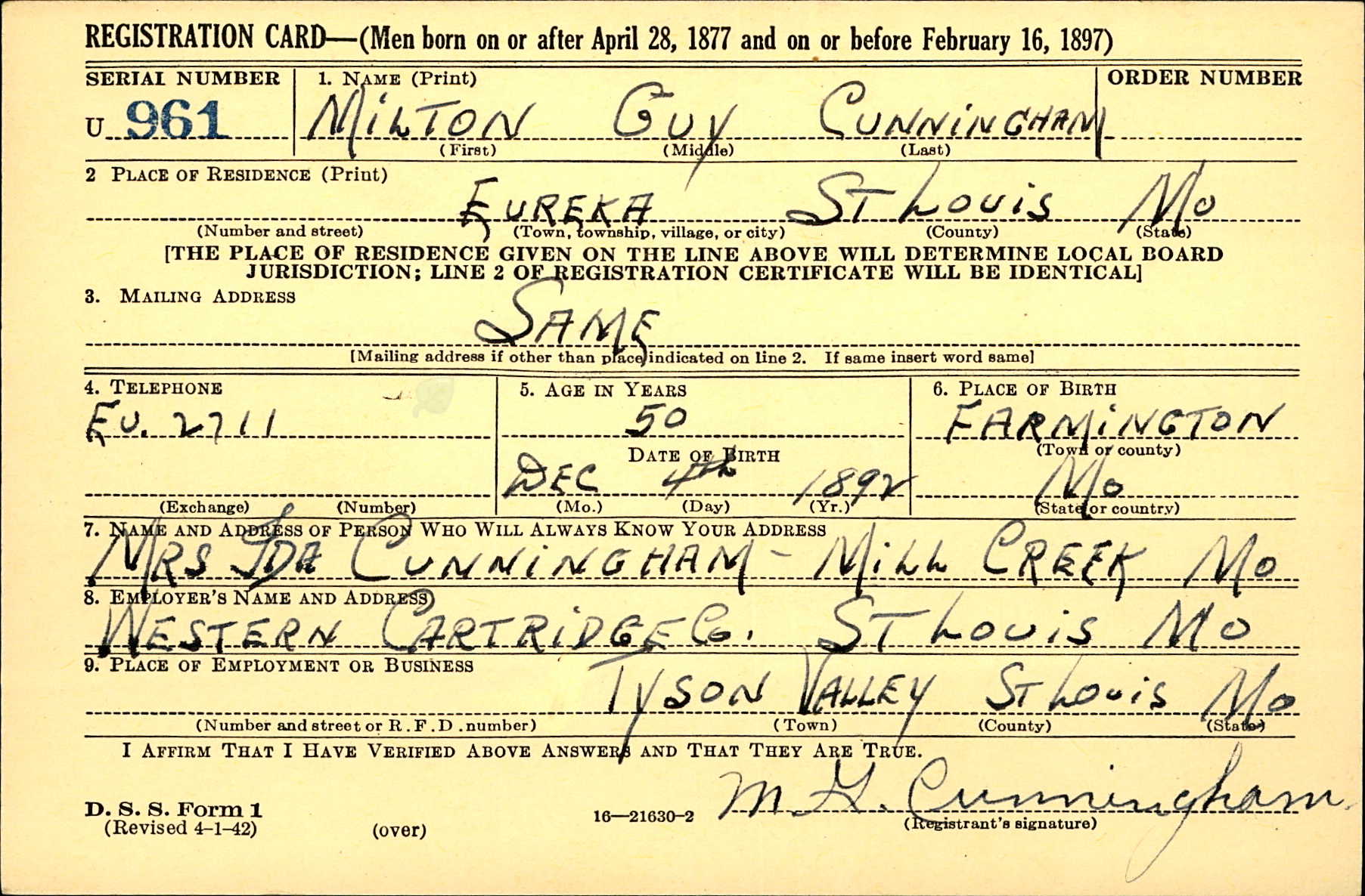 WWII Draft Registration, Milton Guy Cunningham
