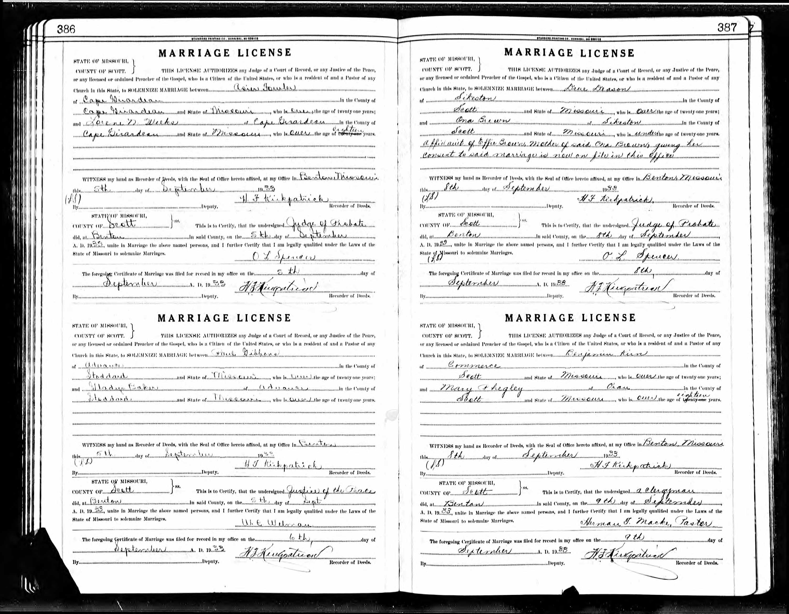 Missouri Marriage Record, Benjamin Kirn and Mary Phegley