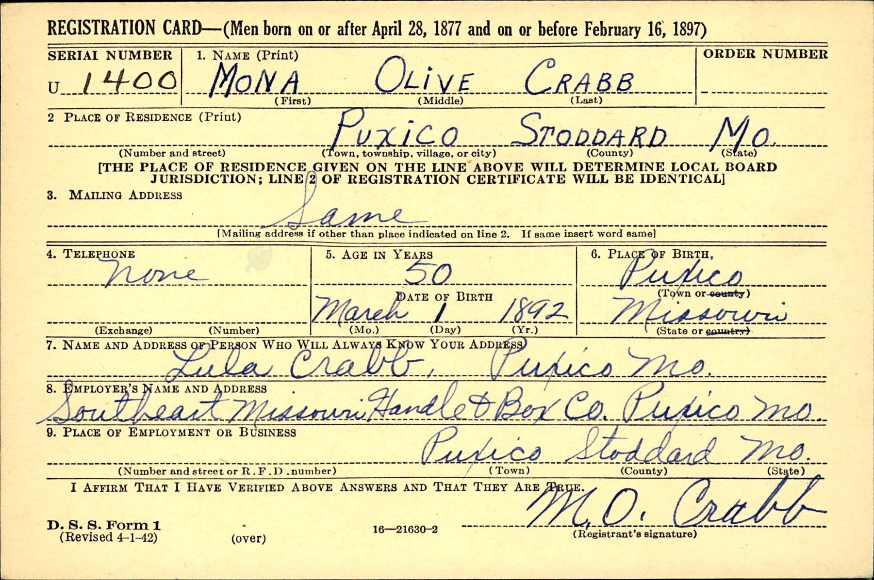 WWII Draft Registration, Mona Olive Crabb