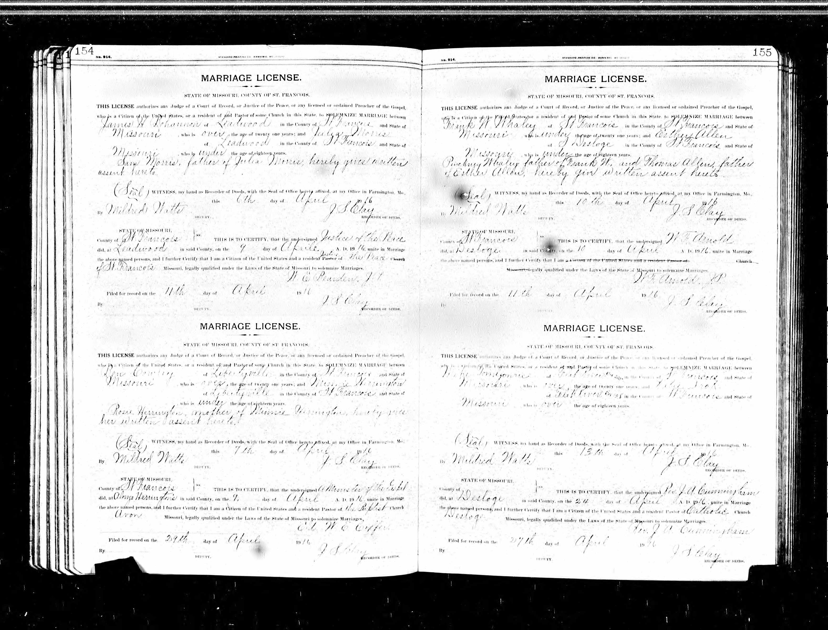 Missouri Marriage Record, Ben Cowley and Minnie Herrington