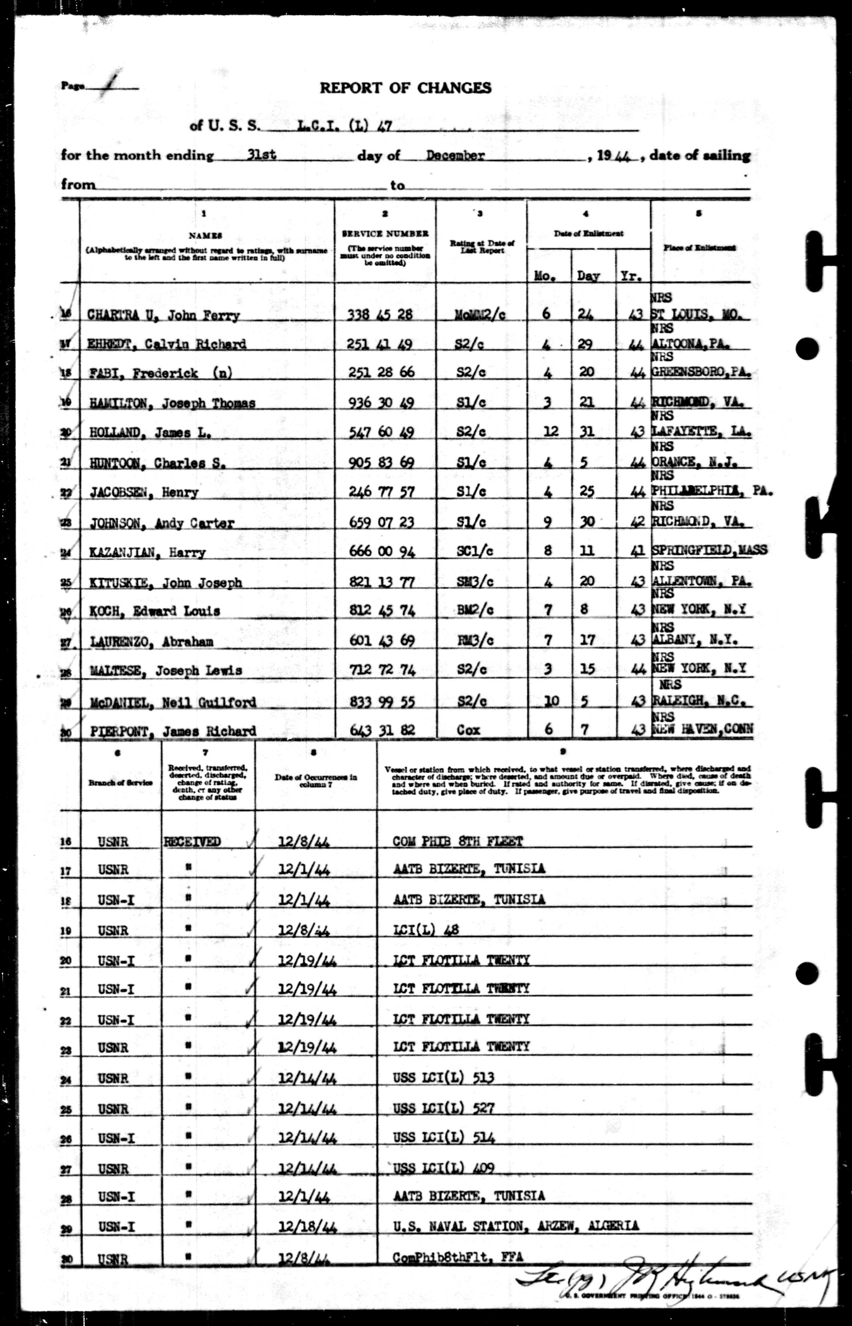 U.S. World War II Navy Muster Rolls, John Perry Chartrau
