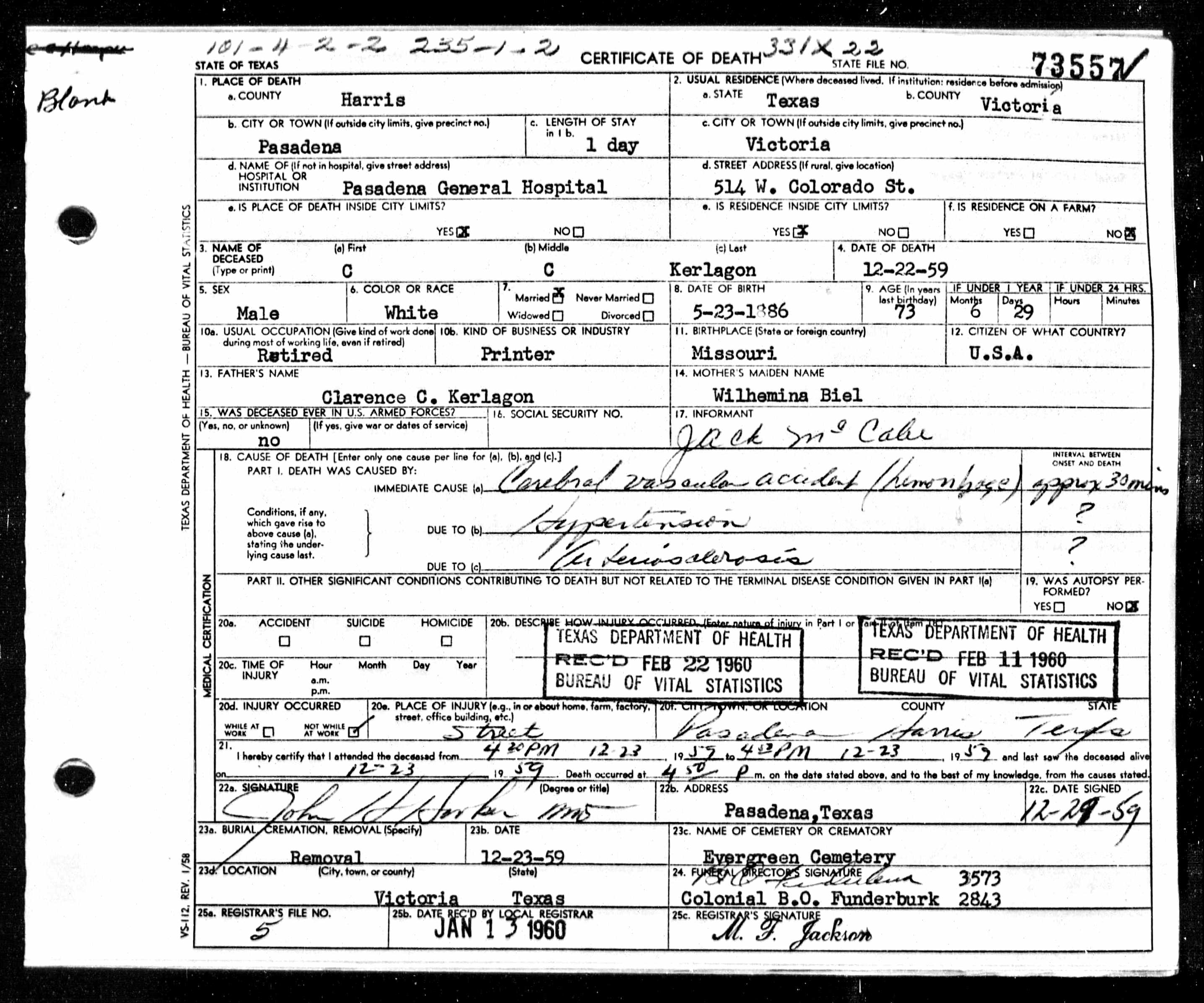 | Death | 22 Dec 1959 | Pasadena General Hospital, Pasadena, Harris, Texas, United States of America | |||||||||||||||||||||||||||||||||||||||||||||||||||||||||||||||||||||||||||||||||||||||||||||||||||||||||||||||||||