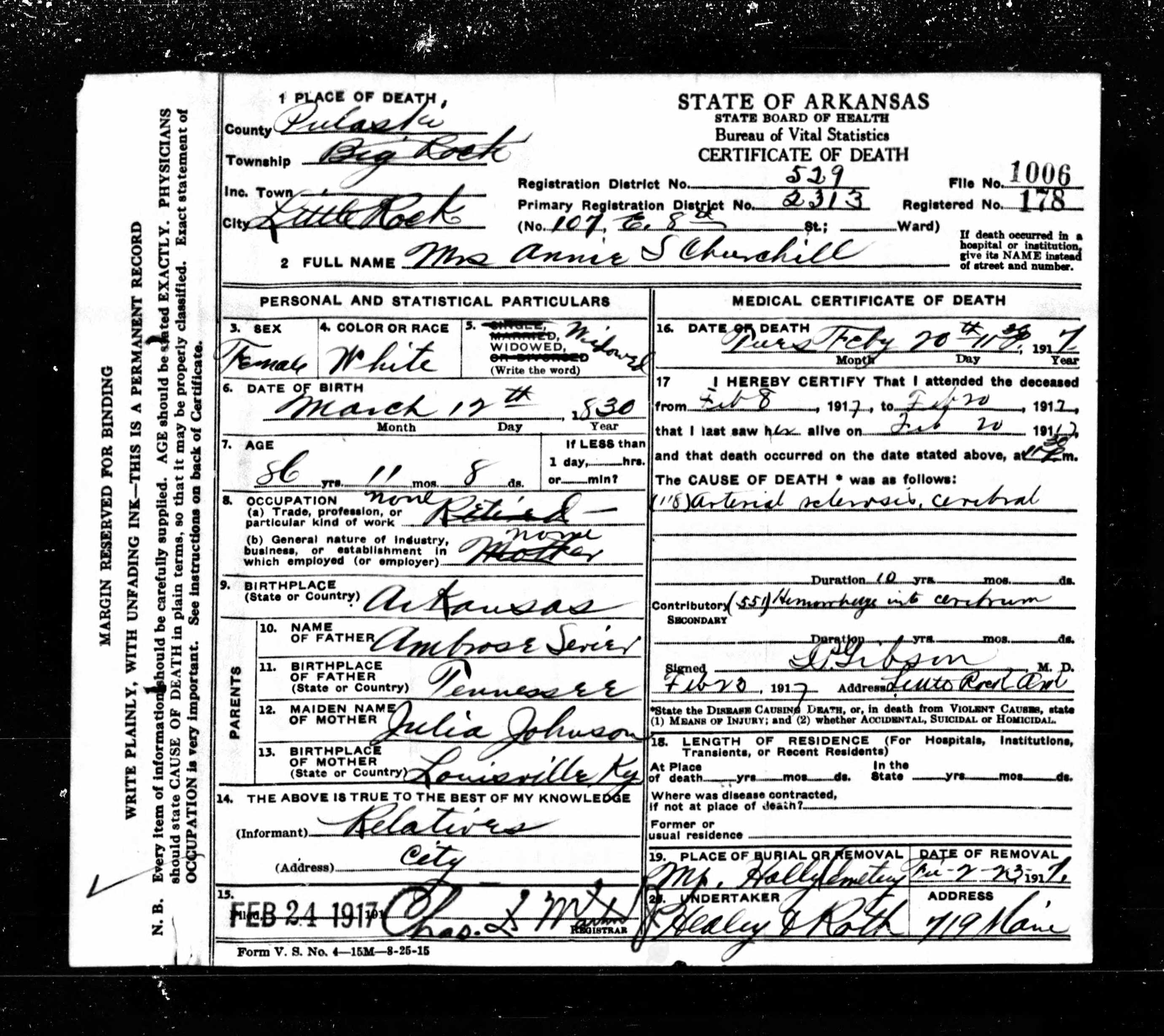 | Death | 20 Feb 1917 | Little Rock, Pulaski, Arkansas, United States of America | ||