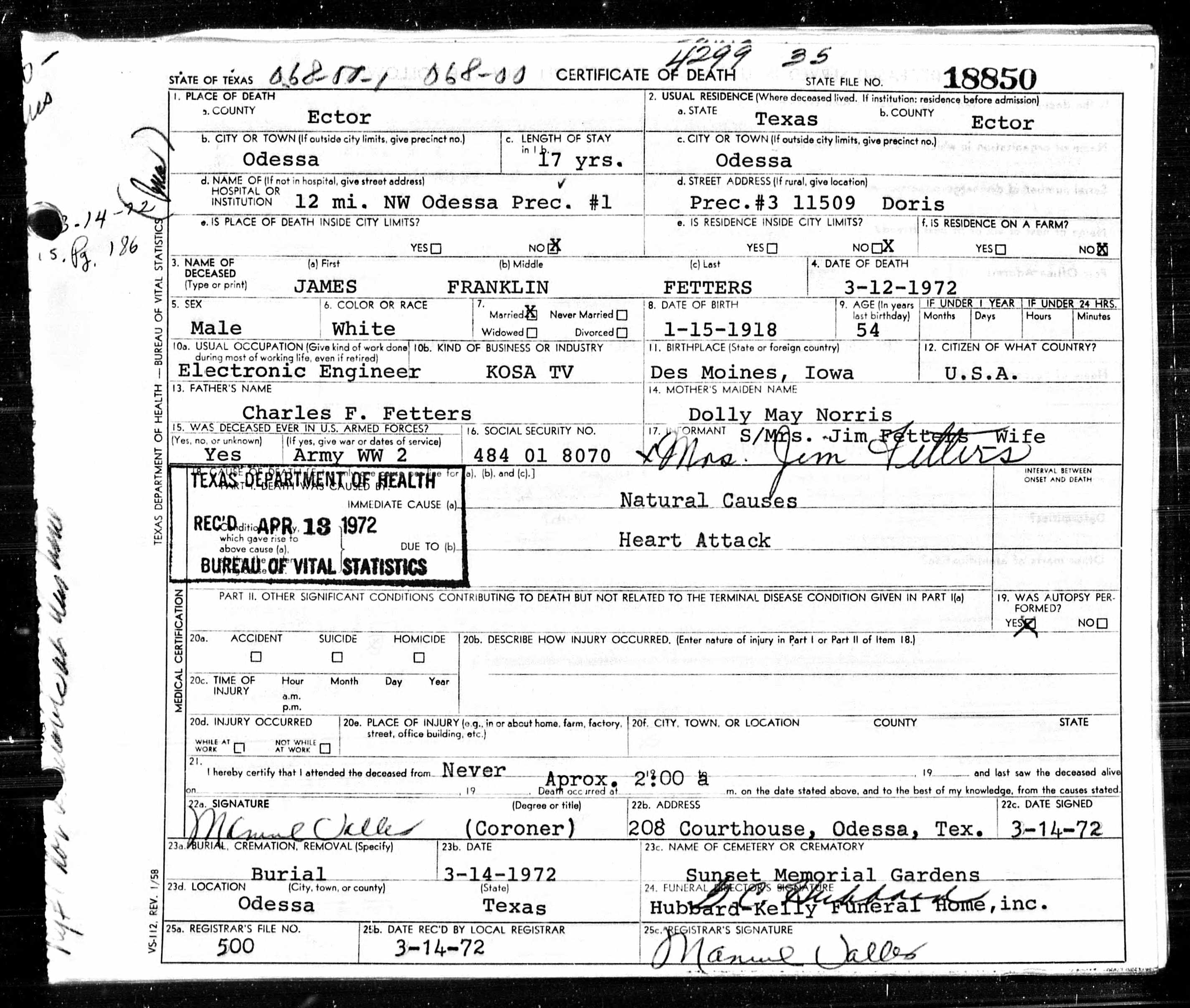 | Burial | 14 Mar 1972 | Sunset Memorial Gardens, Odessa, Ector, Texas, United States of America | |||||||||||||||||||||||||||||||||||||||||||||||||||||||||||||||||||||||||||||||||||||||||||||||||||||||||||||||||||