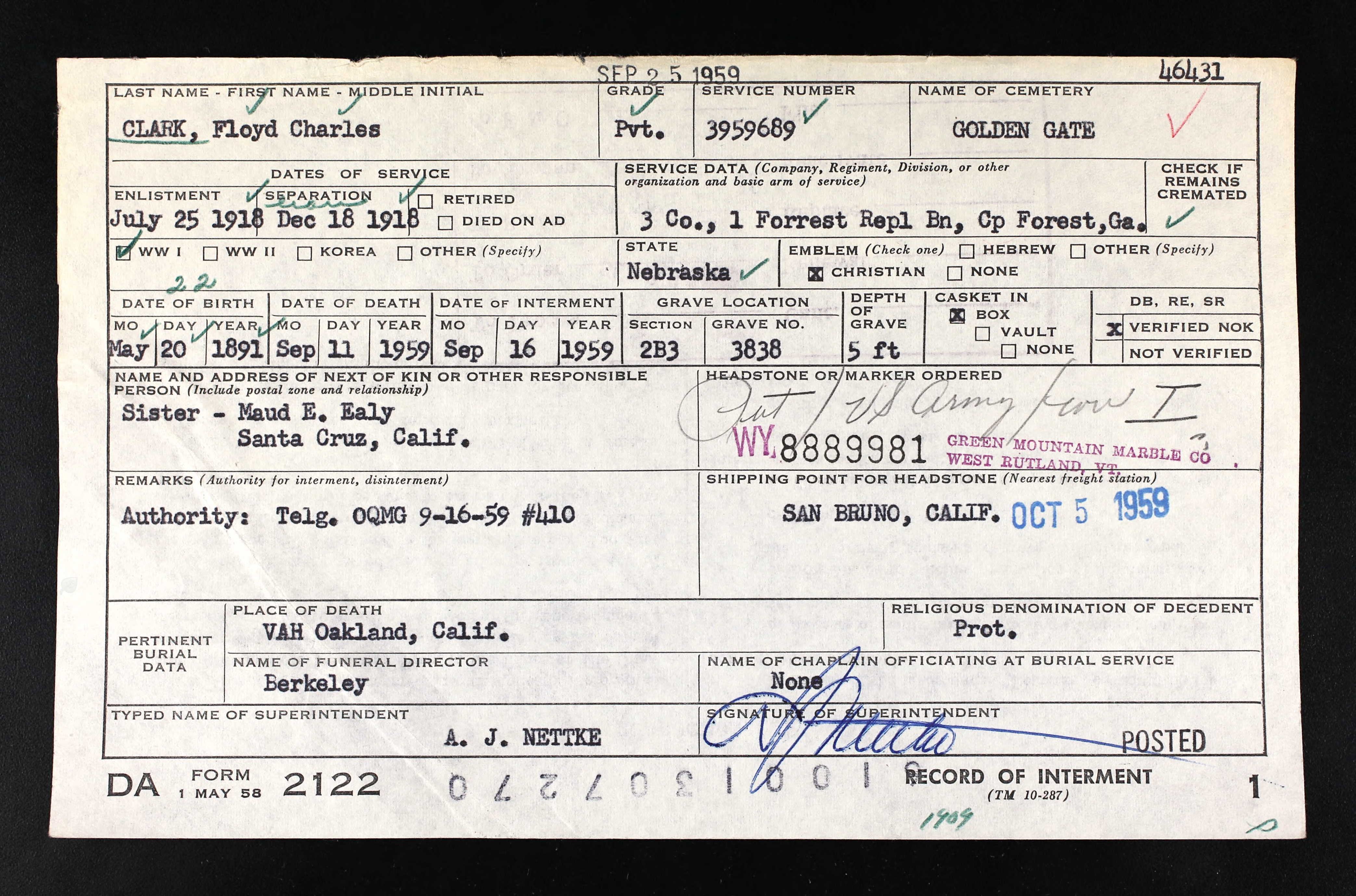 | Burial | 16 Sep 1959 | Golden Gate National Cemetery, San Bruno, San Mateo, California, United States of America | |||||||||||||||||||||||||||||||||||||||||||||||||||||||||||||||||||||||||||||||||||||||||||||||||||||||||||||||||||||||||||||||||||||||||||||||||||||||||||||||||||||