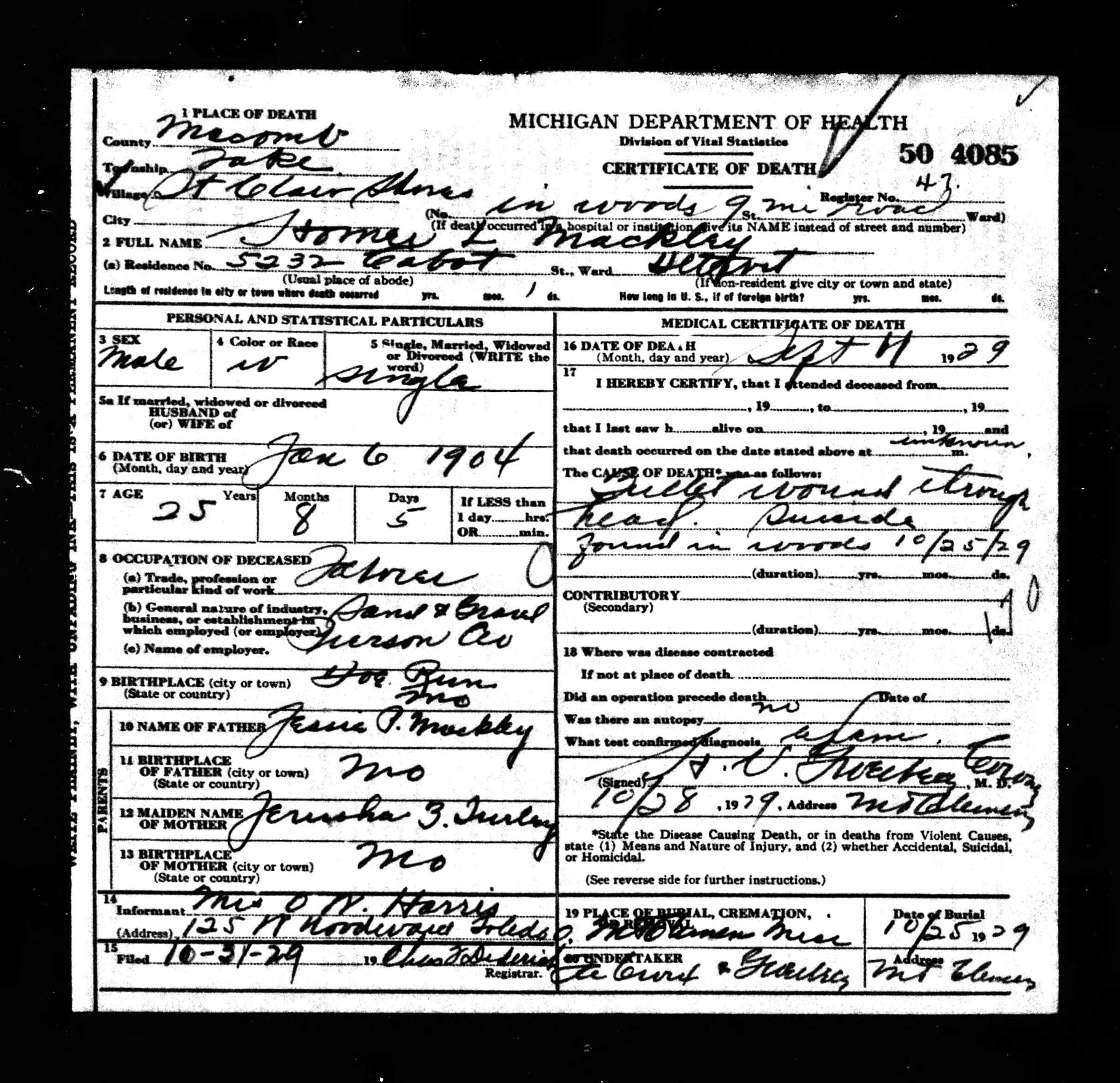 | Mackley, Homer Leon | 5 Jan 1904 | 7 Sep 1929 | ||