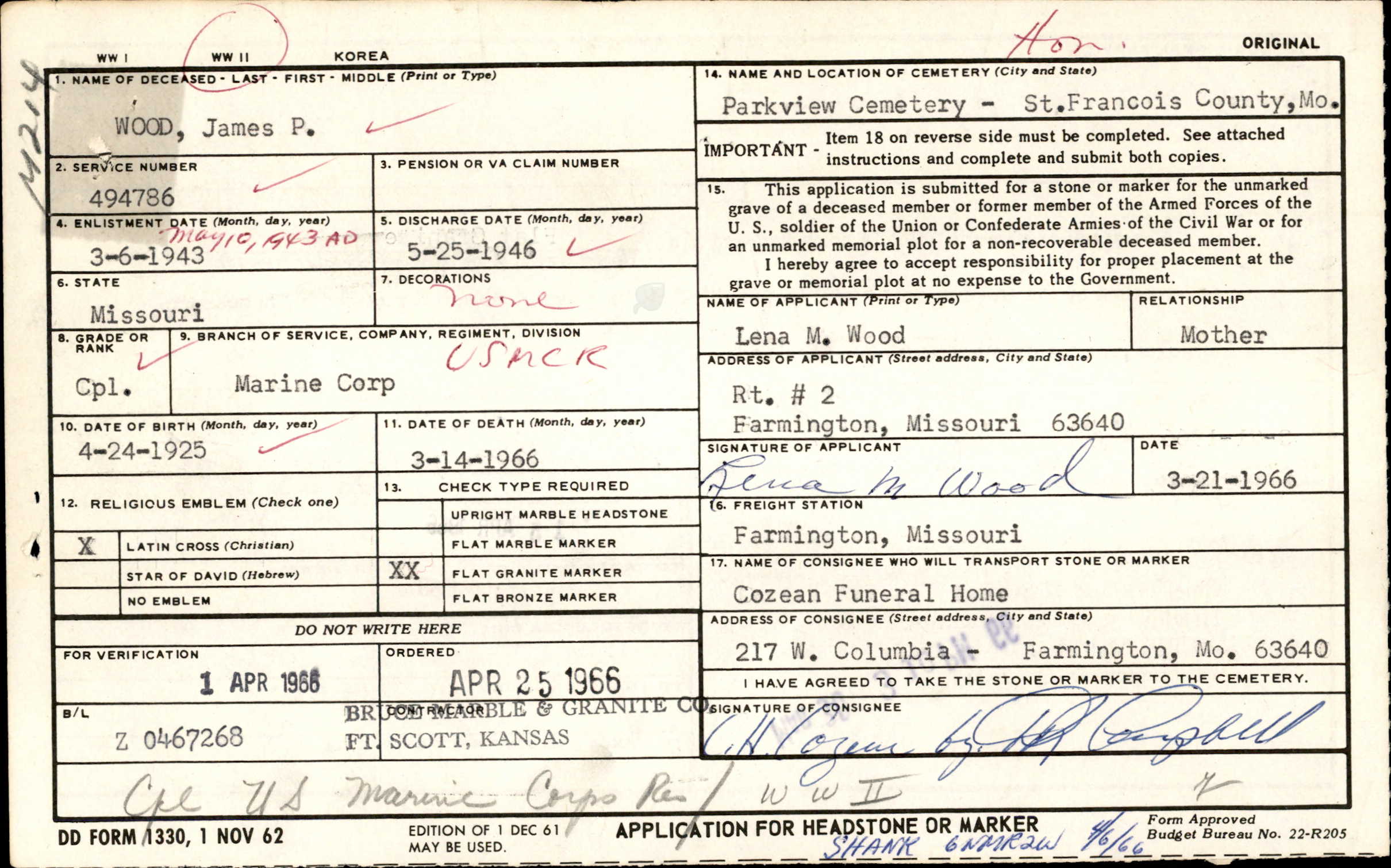 | Wood, James Perry | 24 Apr 1925 | 14 Mar 1966 |