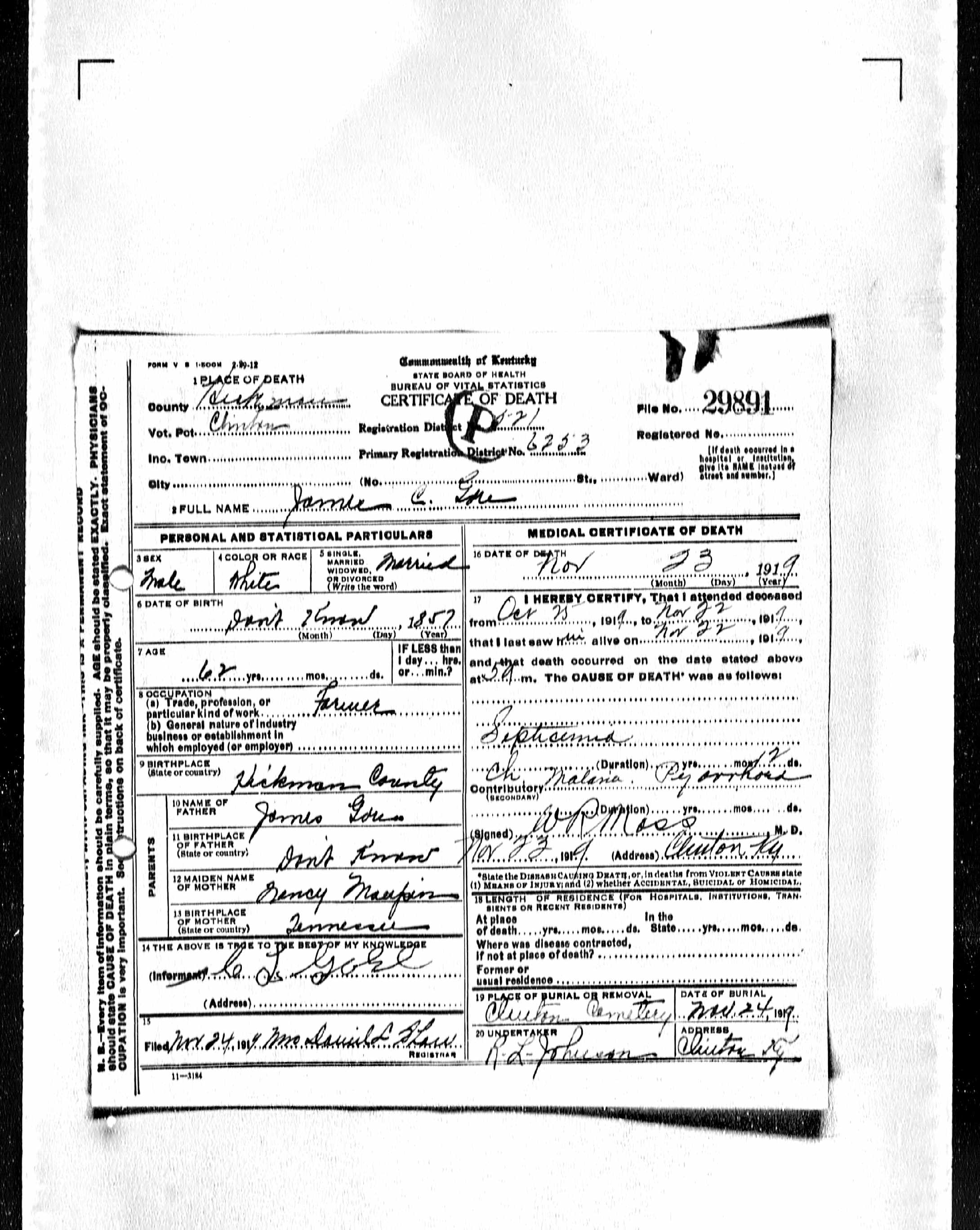 Kentucky birth records and some census records have middle initial as S. Death certificate has middle initial as C. |