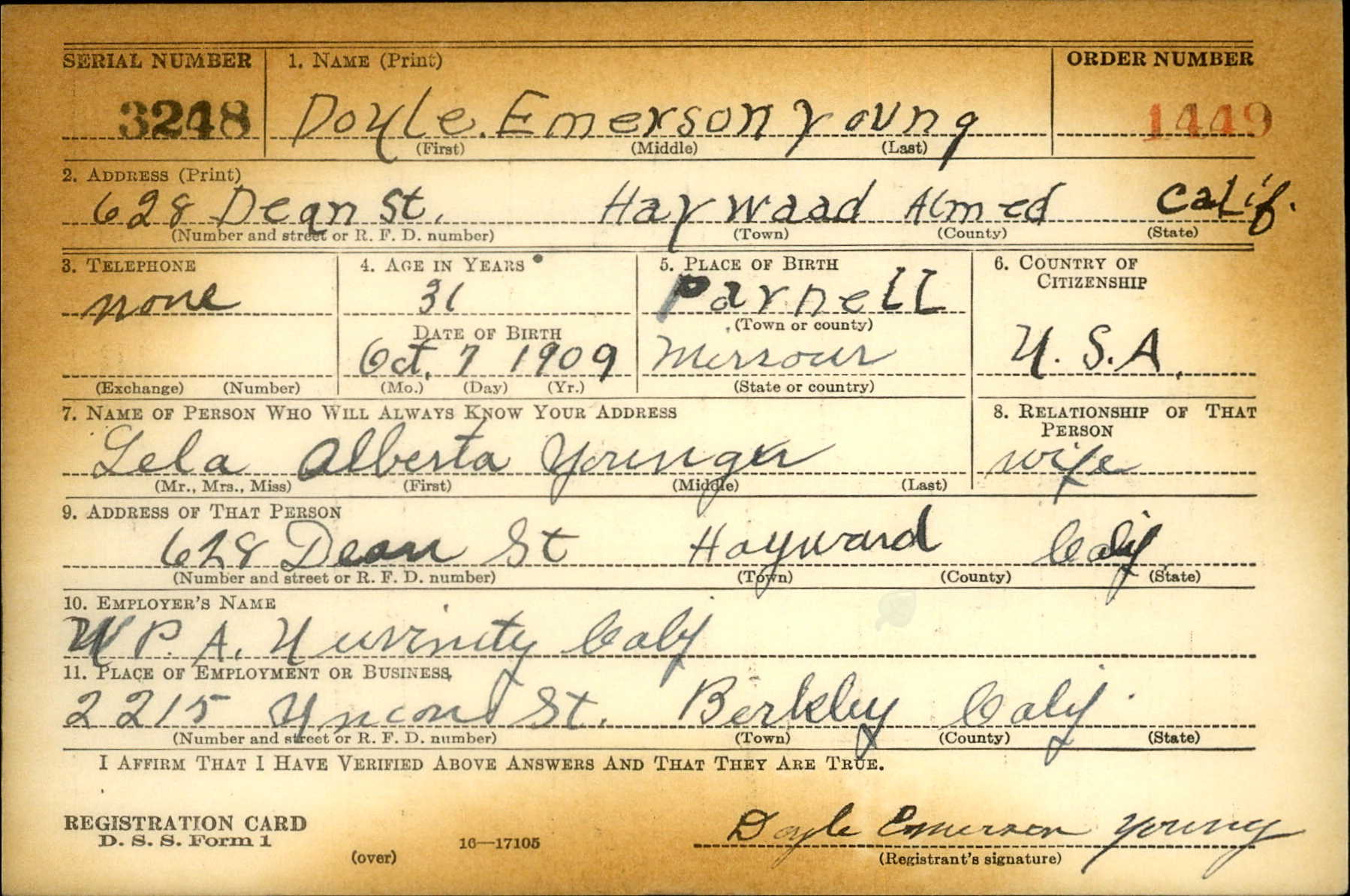 | Census | 1 Apr 1940 | Hayward, Alameda, California, United States of America | Doyle Young Household, 1940 Census | 6a | |||||||||||||||||||||||||||||||||||||||||||||||||||||||||||||||||||||||||||||||||||||||||||||||||||||||||||||||||||||||||||||||||||||||||||||||||||||||||||||||||||