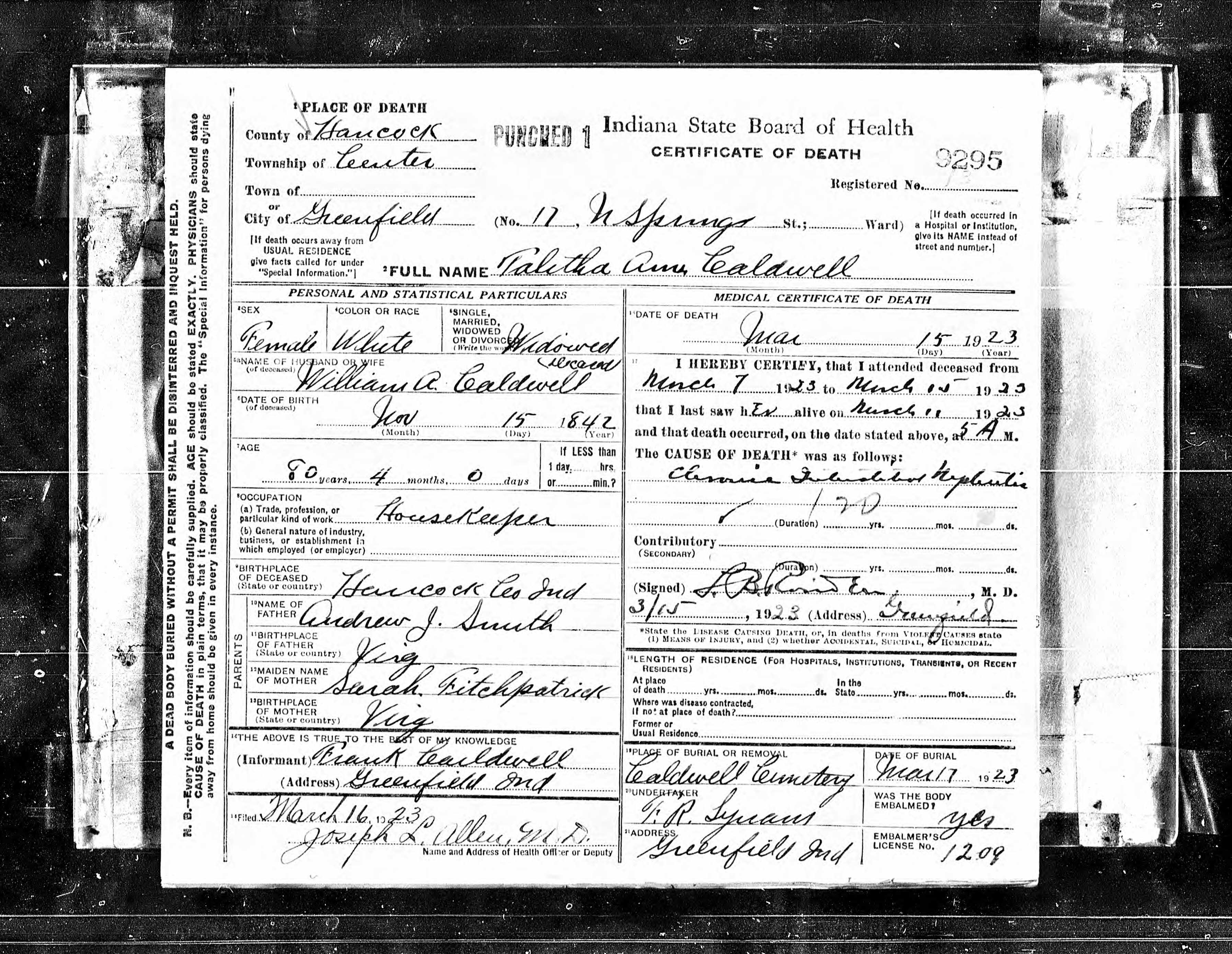 | Burial | 17 Mar 1923 | Caldwell Cemetery, Center, Hancock, Indiana, United States of America | ||||||||||||||||||||||||||||||||||||||||||||||||||||||||||||||||||||||