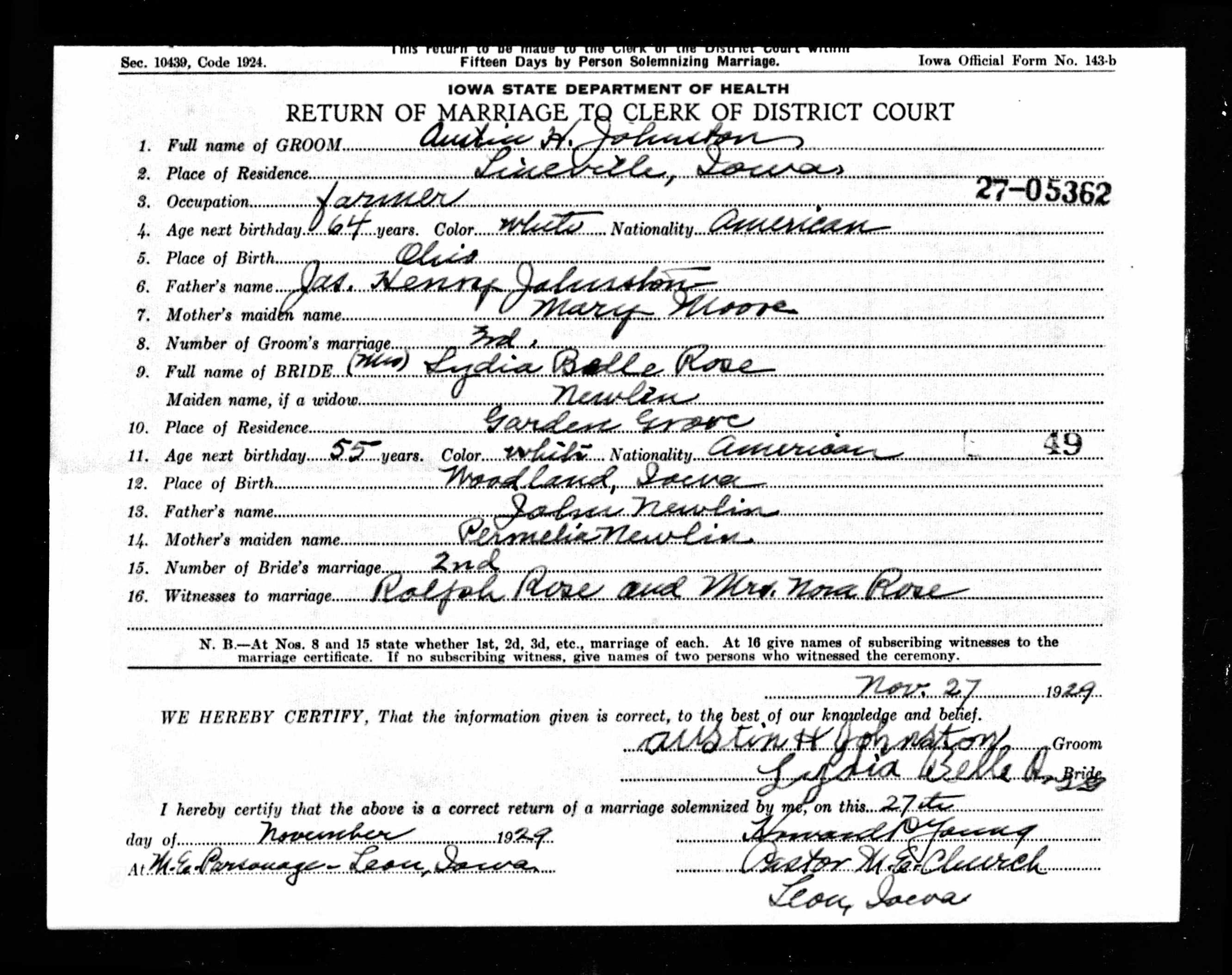 Family of Johnston, Austin Henry and Newlin, Lydia Belle