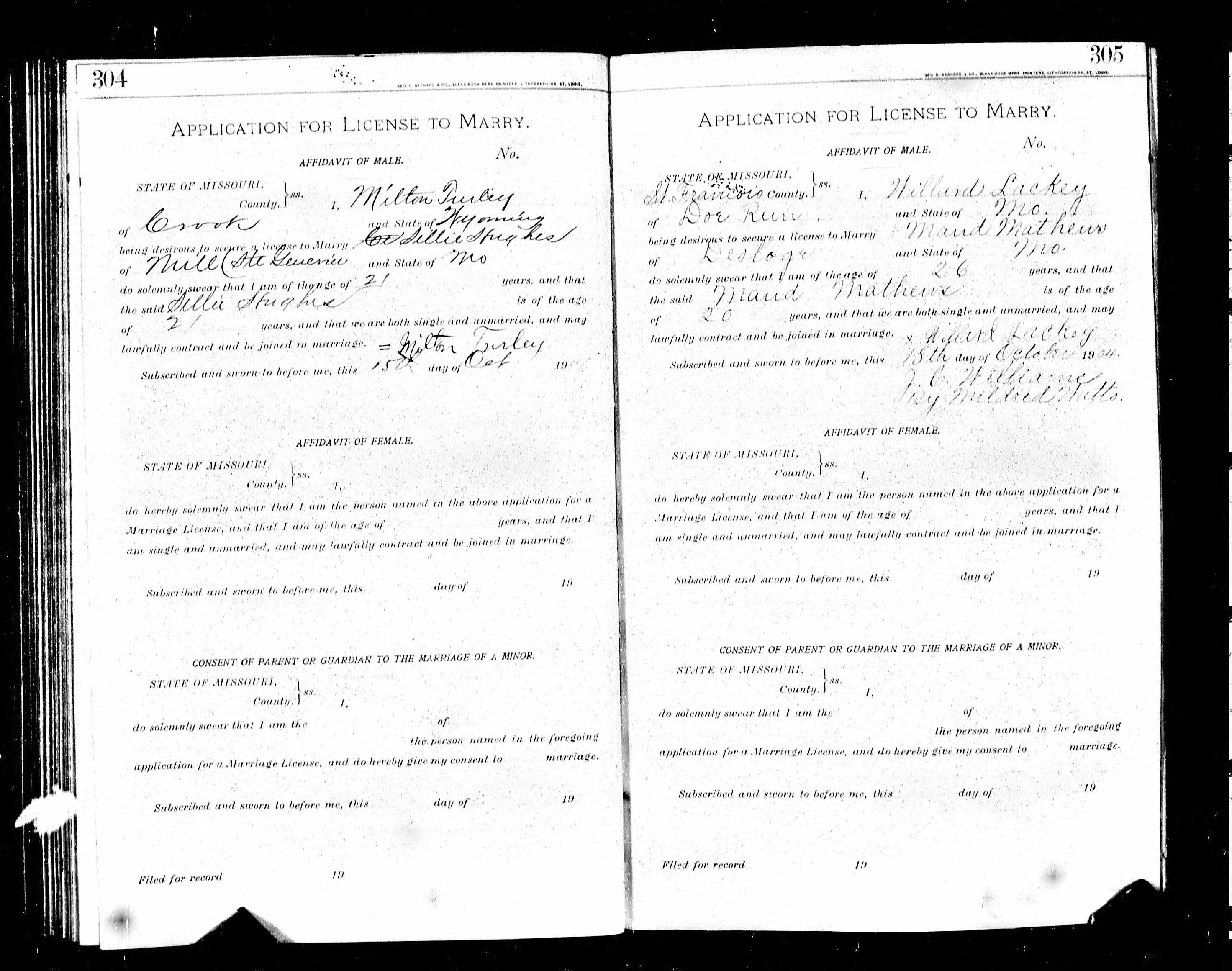 Missouri Marriage Application, Milton Turley and Sillie Hughes