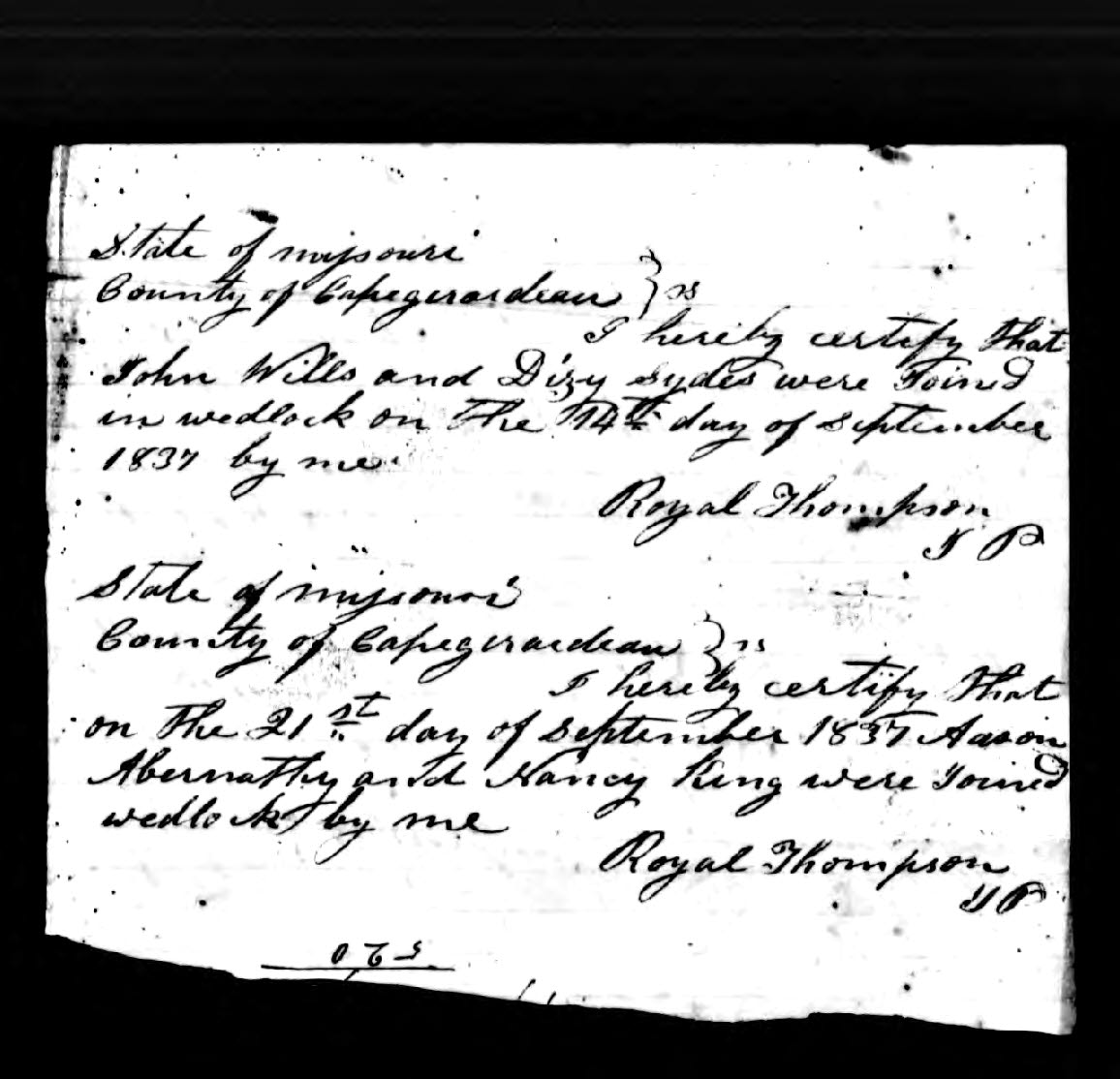 Missouri Marriage Records, John Wills and Dizy Sydes, Aaron Abernathy and Nancy King
