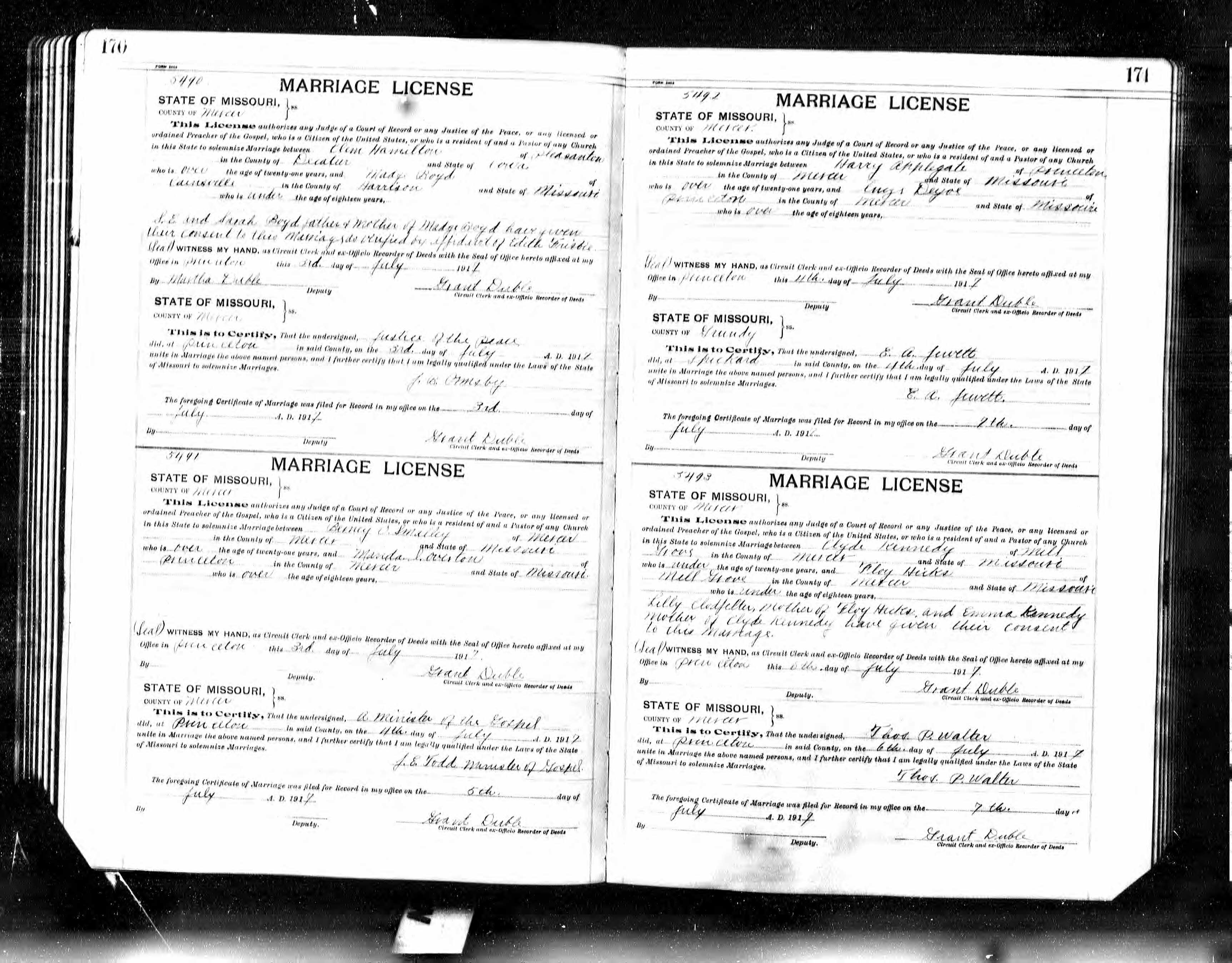 Missouri Marriage Record, Clem Hamilton and Madge Boyd
