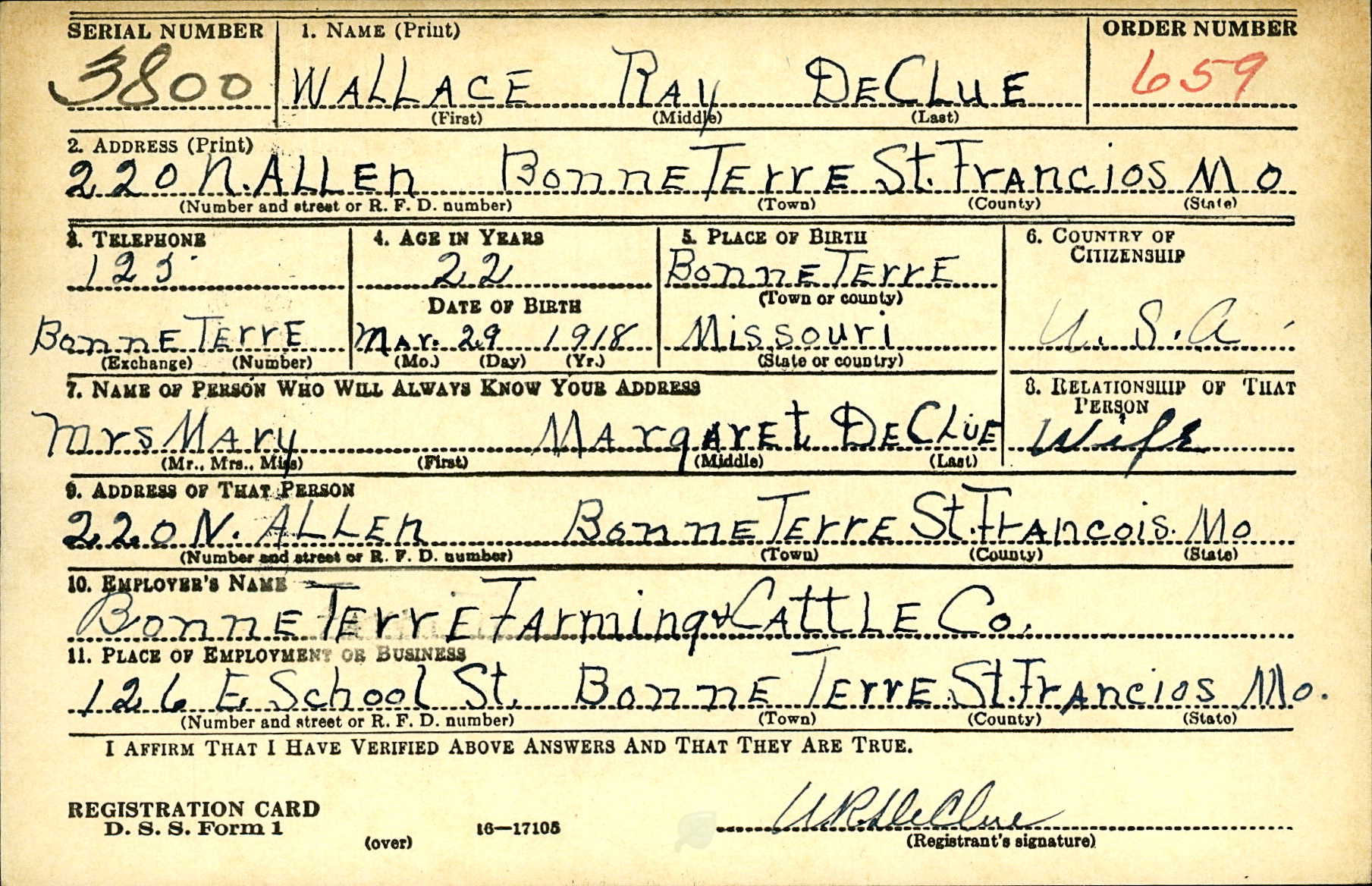 WWII Draft Registration, Wallace Ray DeClue