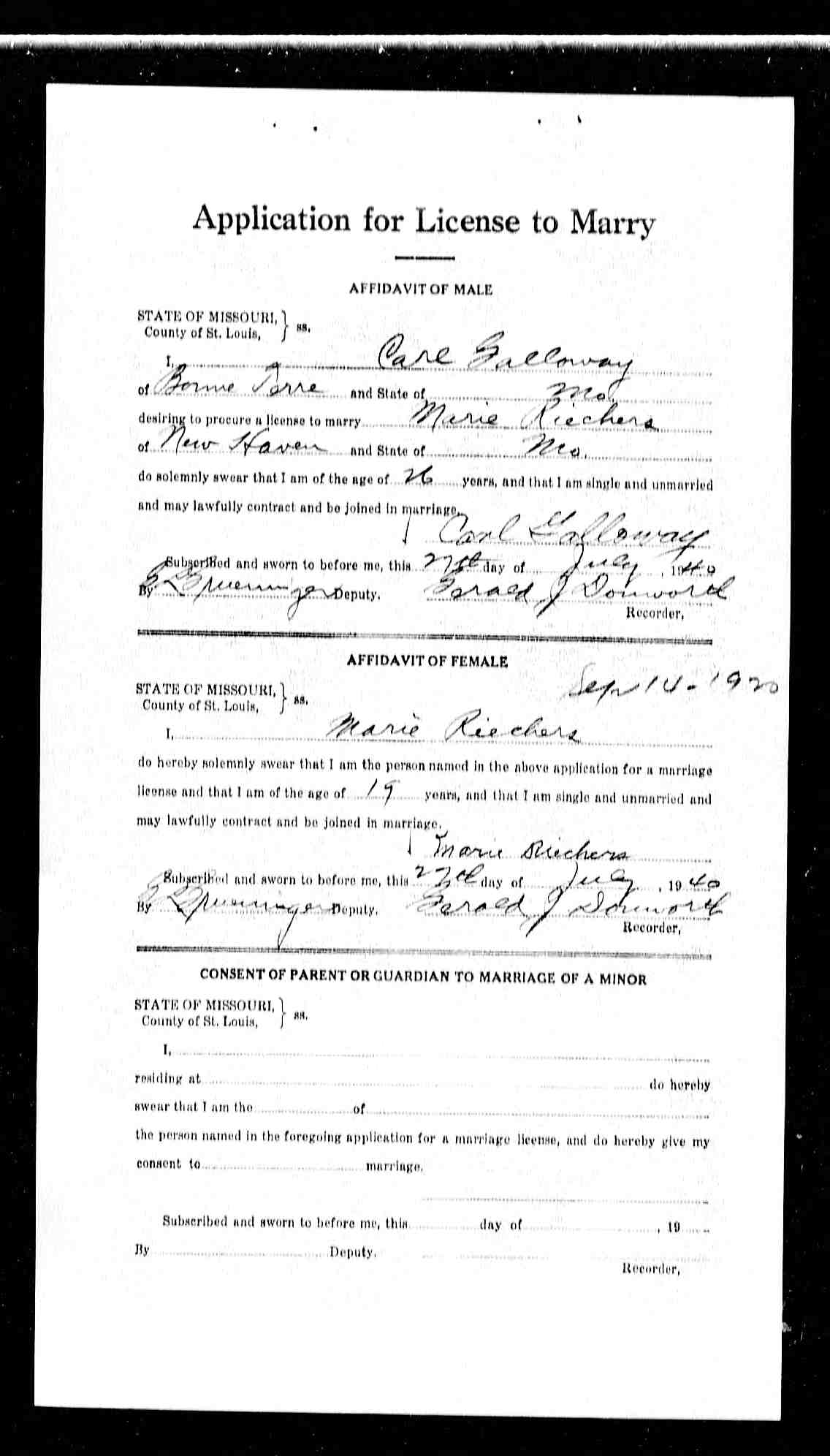 Missouri Marriage Application, Carl Galloway and Marie Riechers