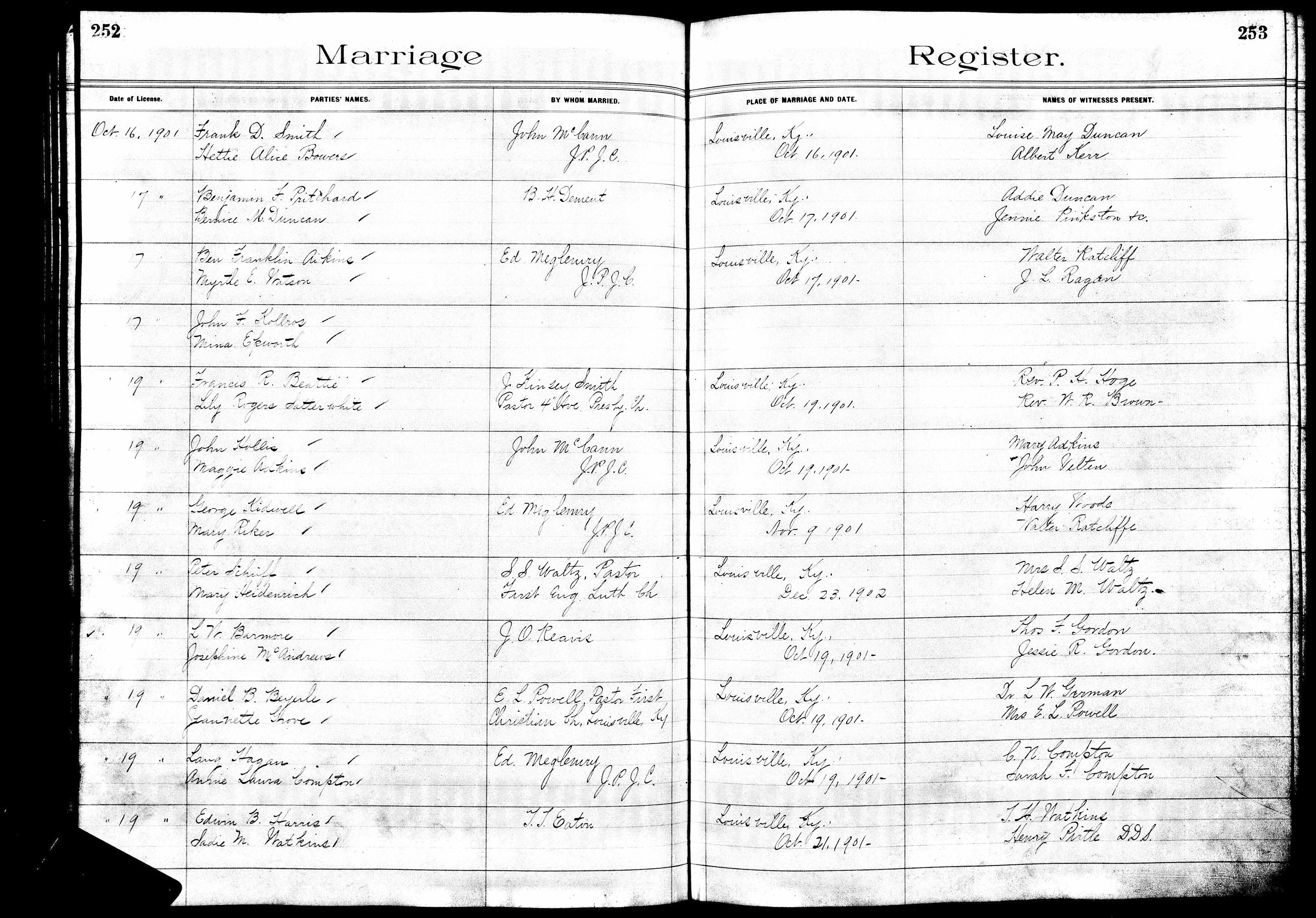Kentucky Marriage Record, Francis R. Beattie and Lily Rogers Satterwhite