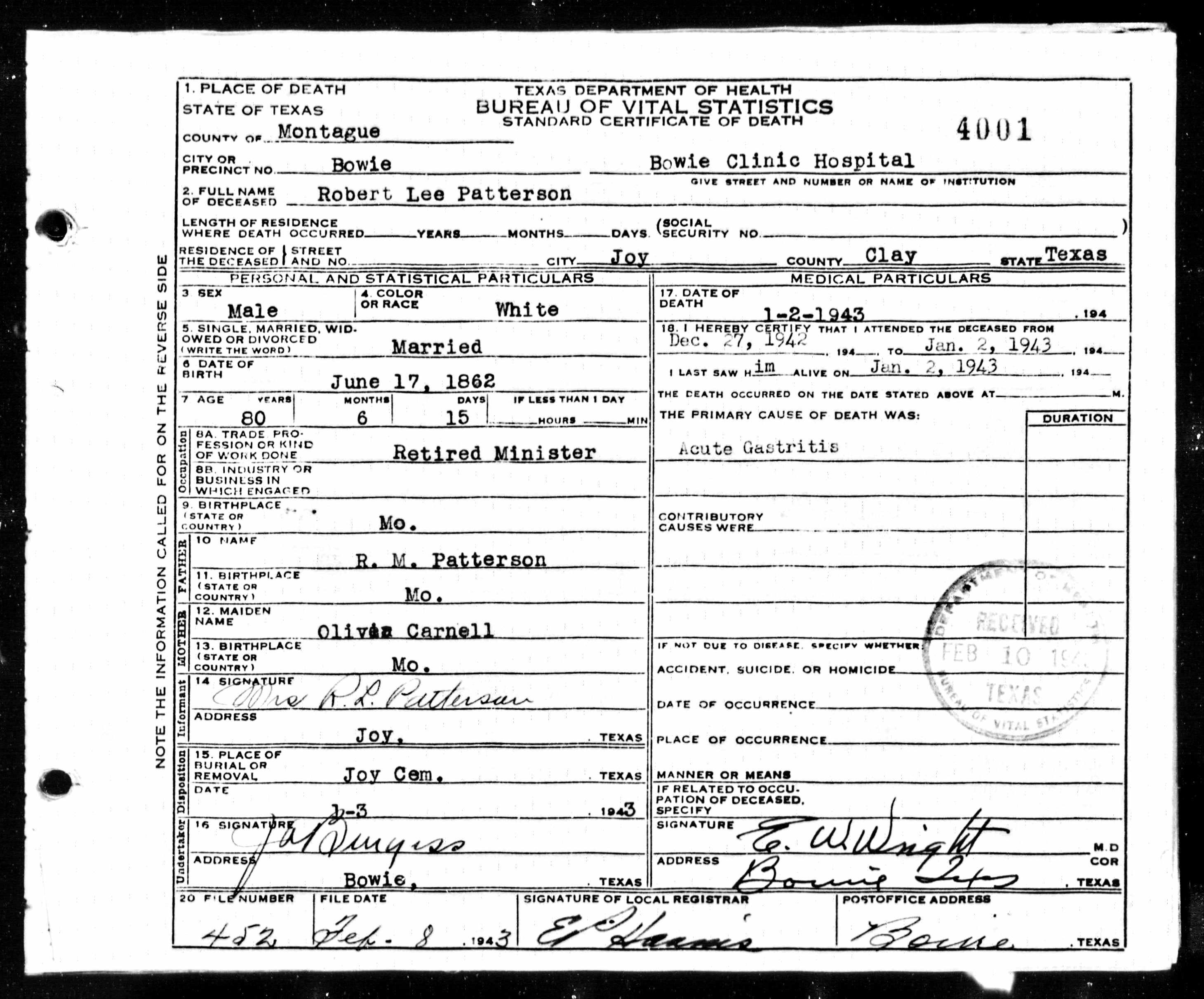 Death Certificate, Robert Lee Patterson