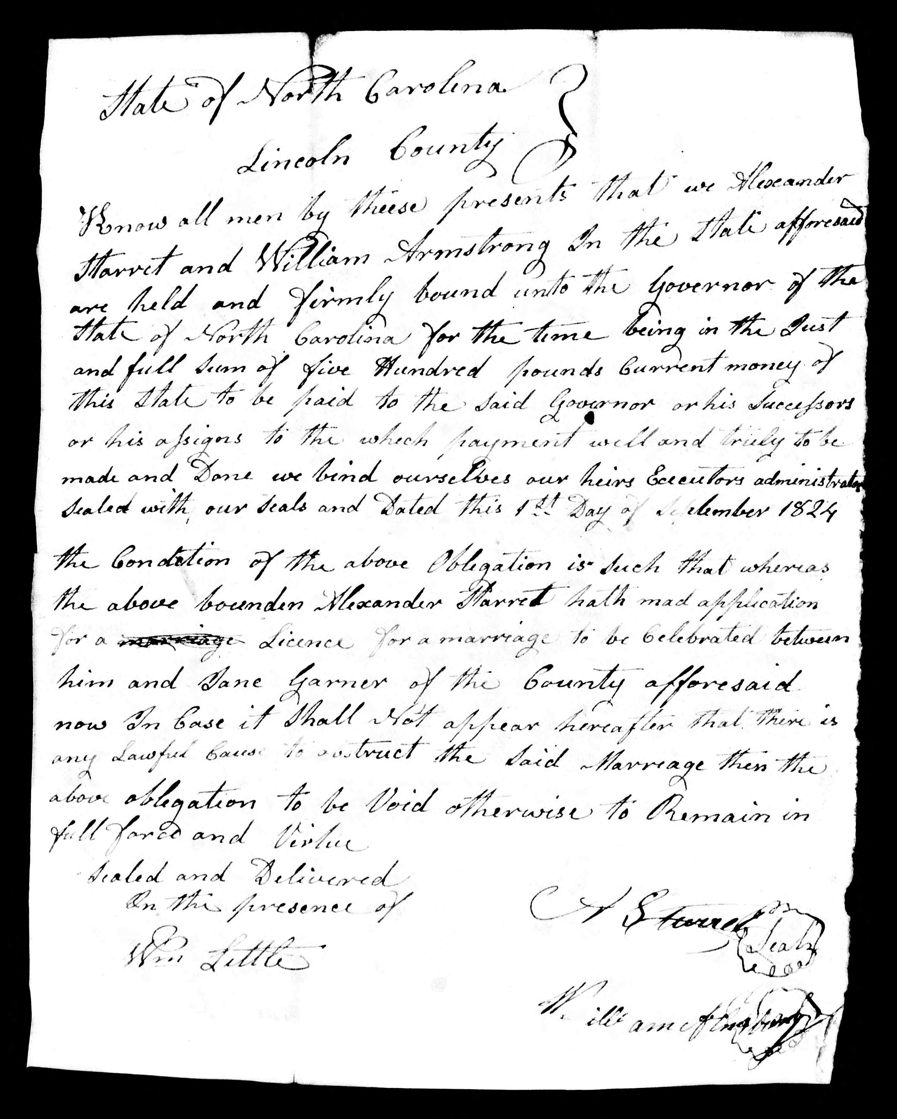 North Carolina Marriage Record, Alexander Starret and Jane Garner