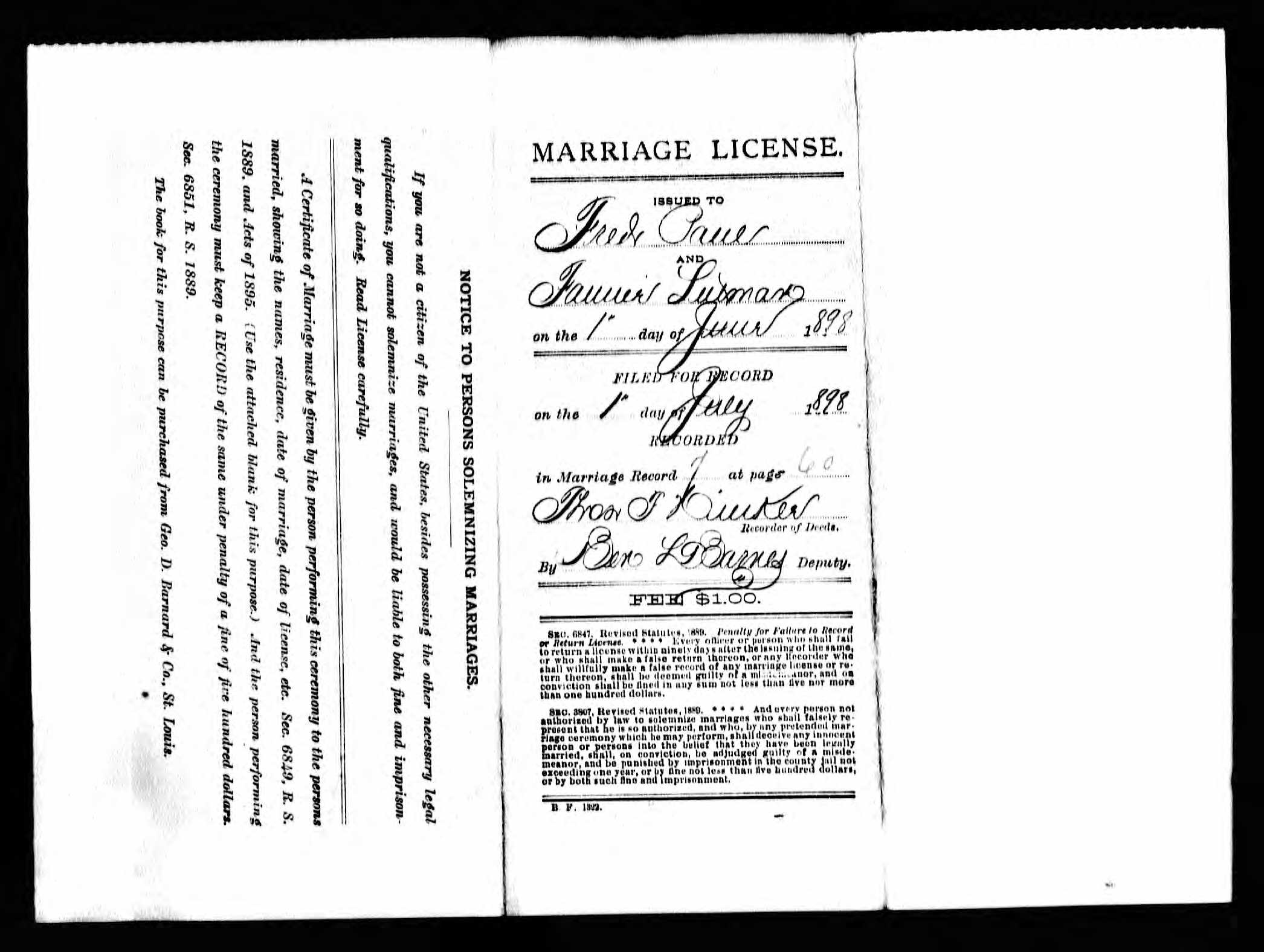 Missouri Marriage Record, Fred Paul and Fannie Lutman