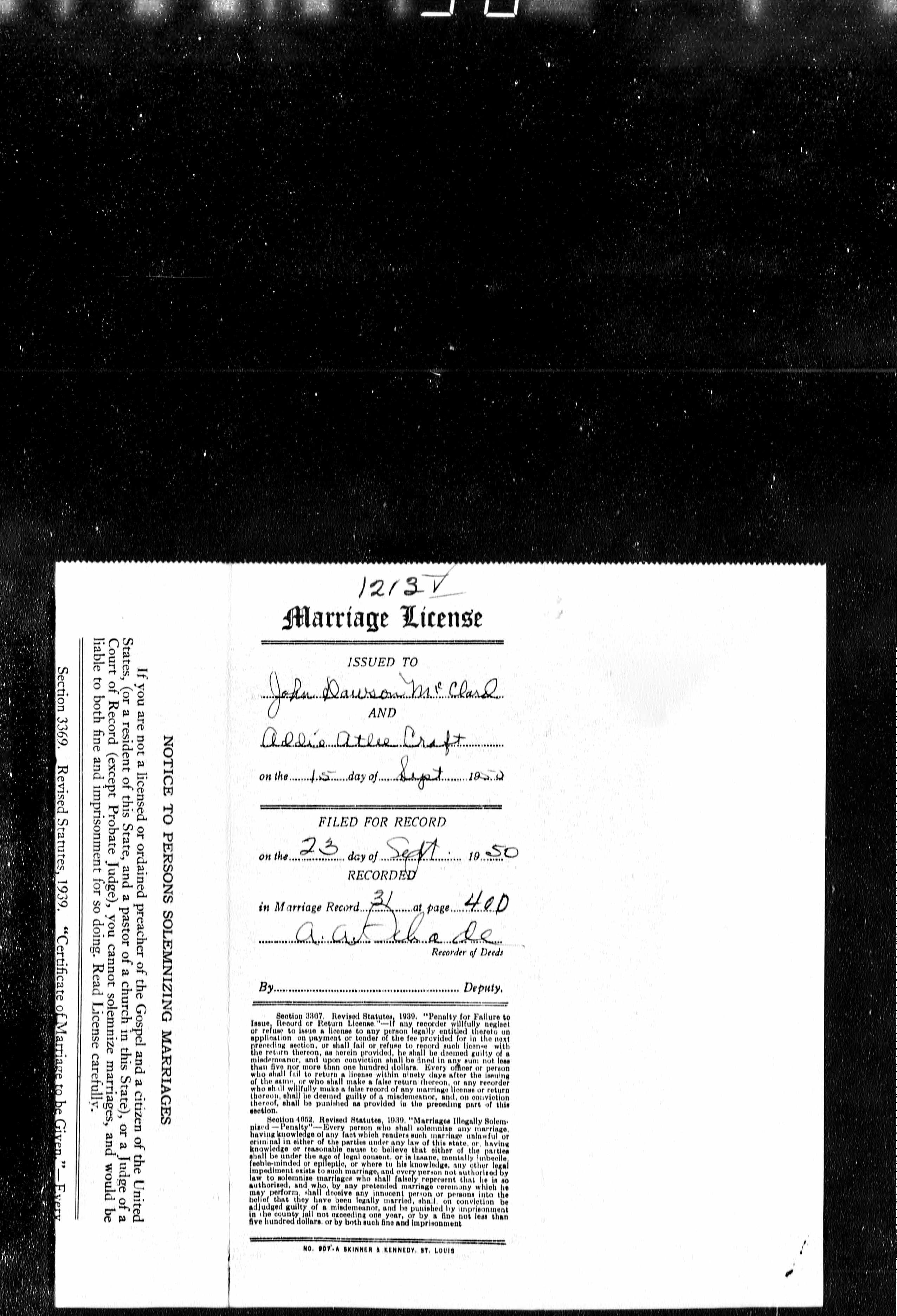 Missouri Marriage Record, John Dawson McClard and Addie Atlee Craft