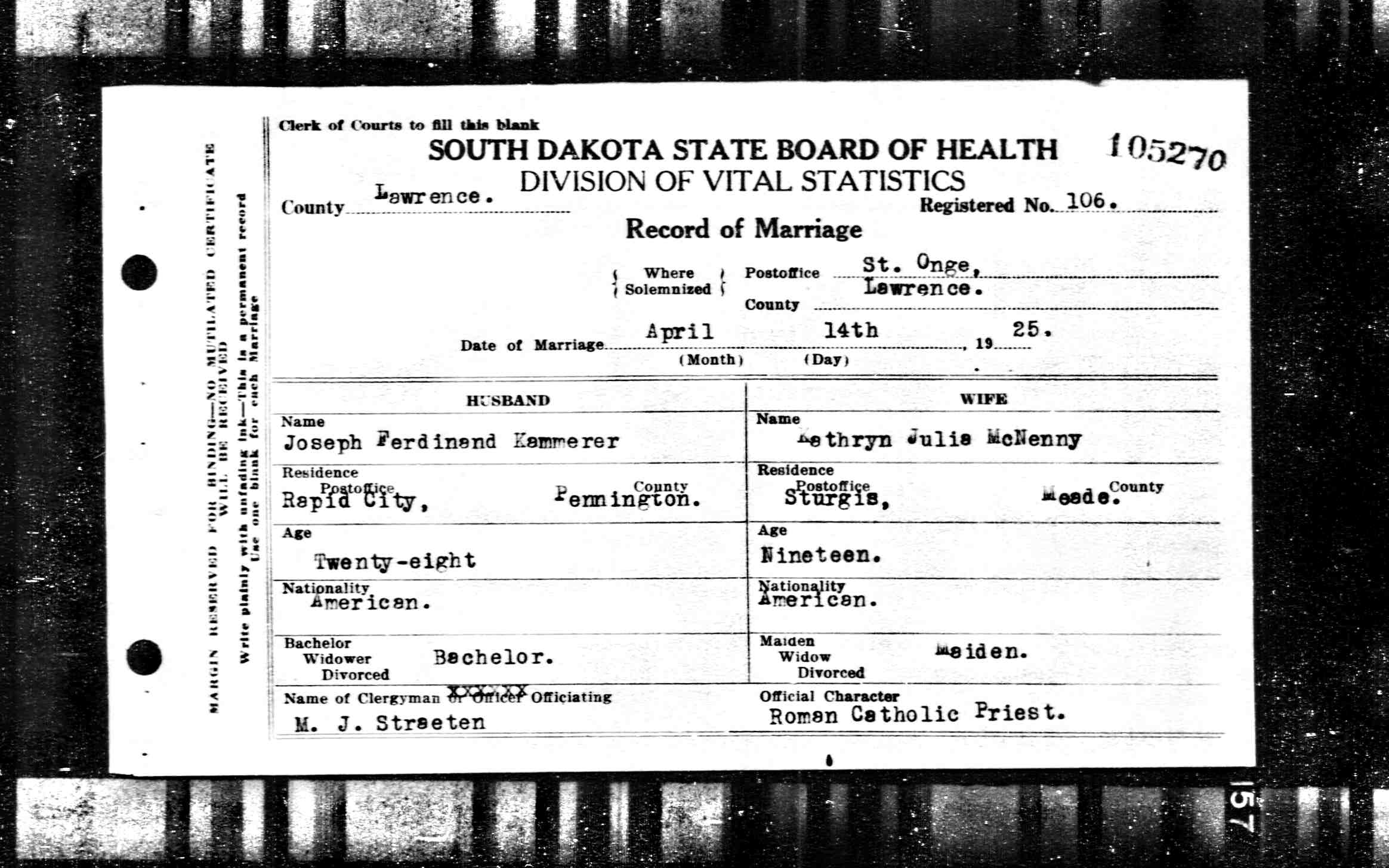 South Dakota Marriage Record, Joseph Ferdinand Kammerer and Kathryn Julia McNenny