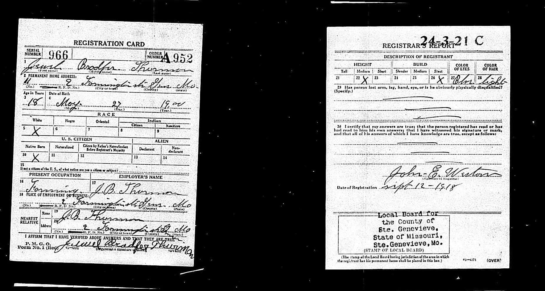 WWI Draft Registration, Jewel Bradfer Thurman