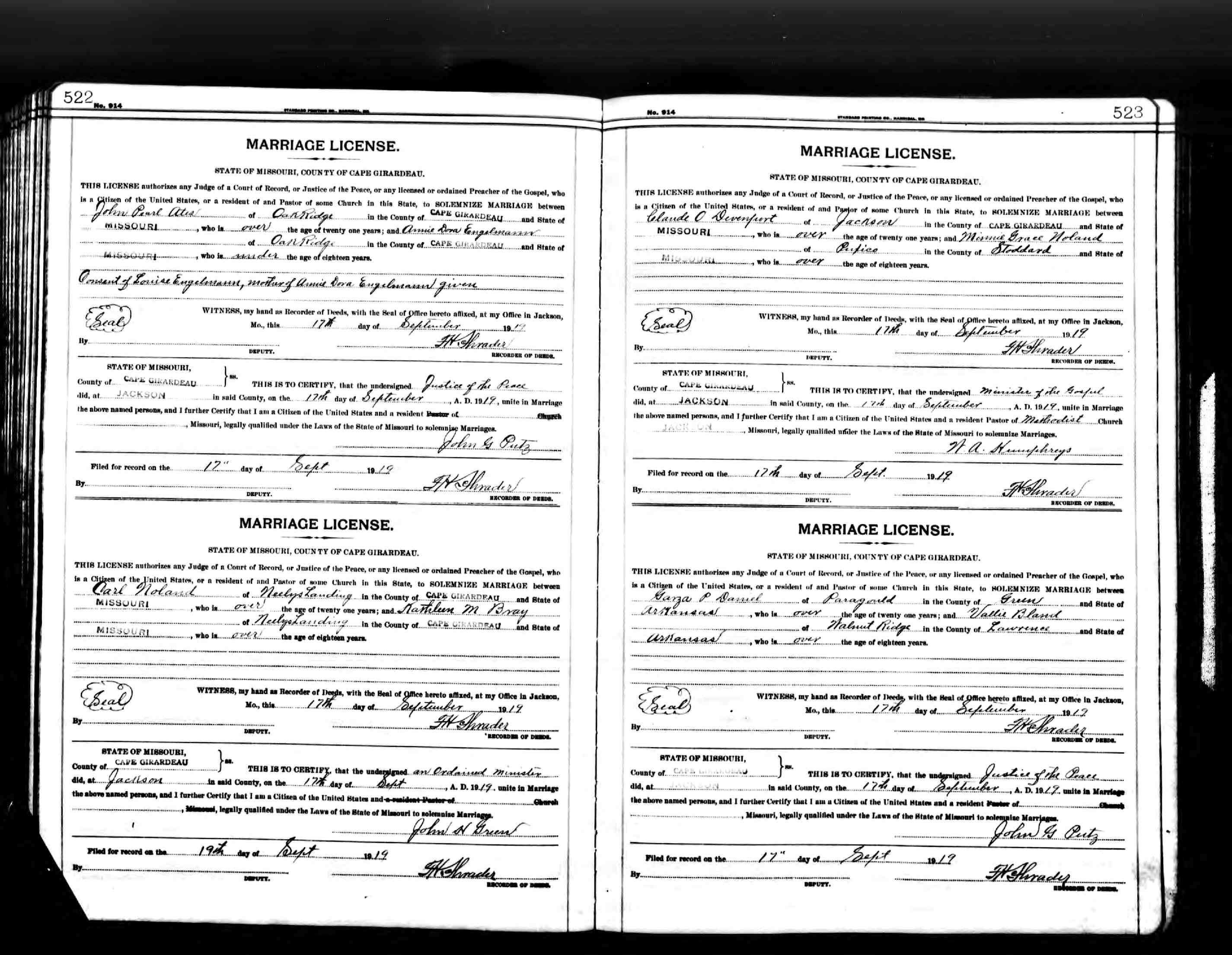 Missouri Marriage Records, Carl Noland and Kathleen M. Bray, Claude O. Devenport and Minnie Grace Noland