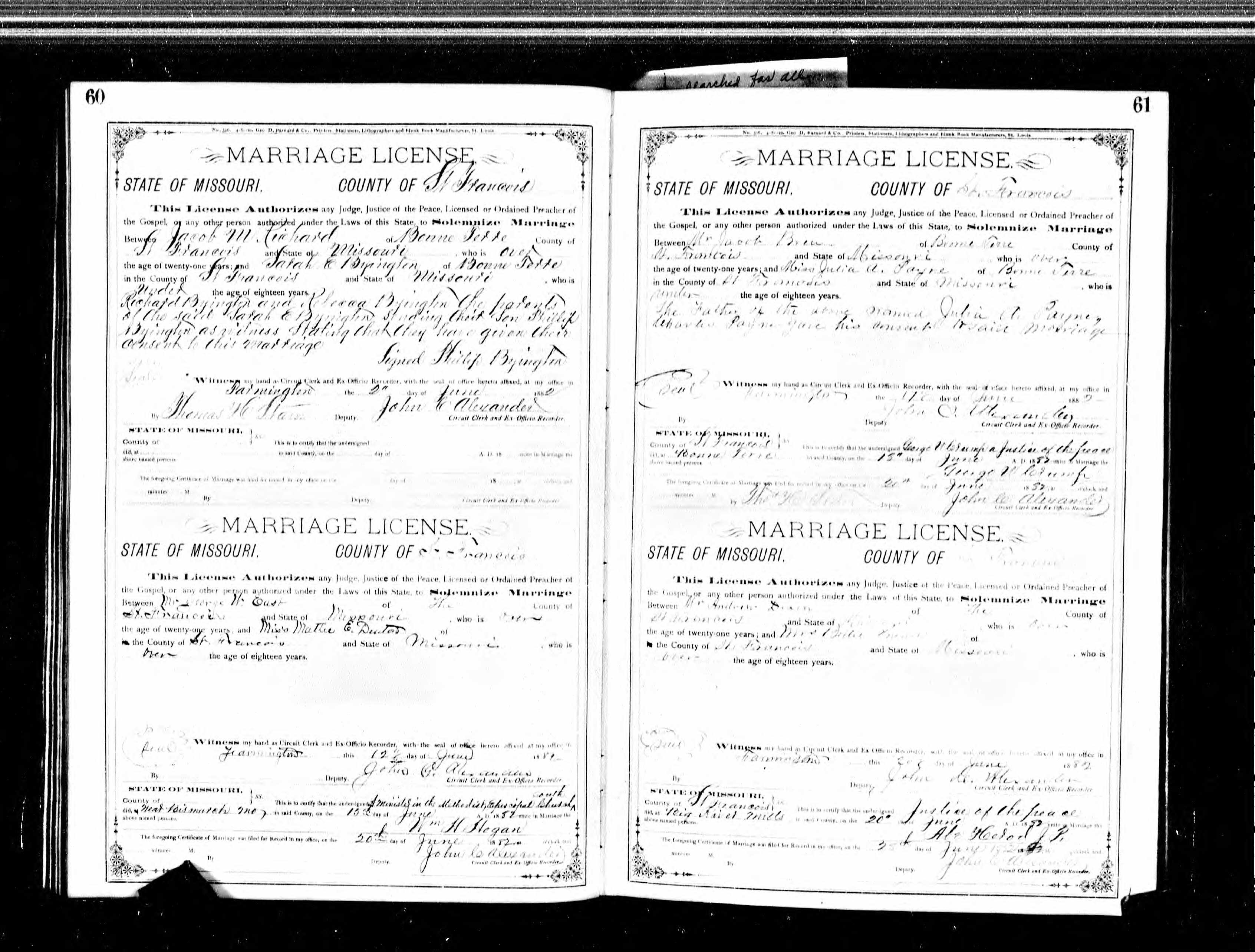 Missouri Marriage Records, Jacob M. Rickard and Sarah E. Byington, Jacob Brieme and Julia A. Payne