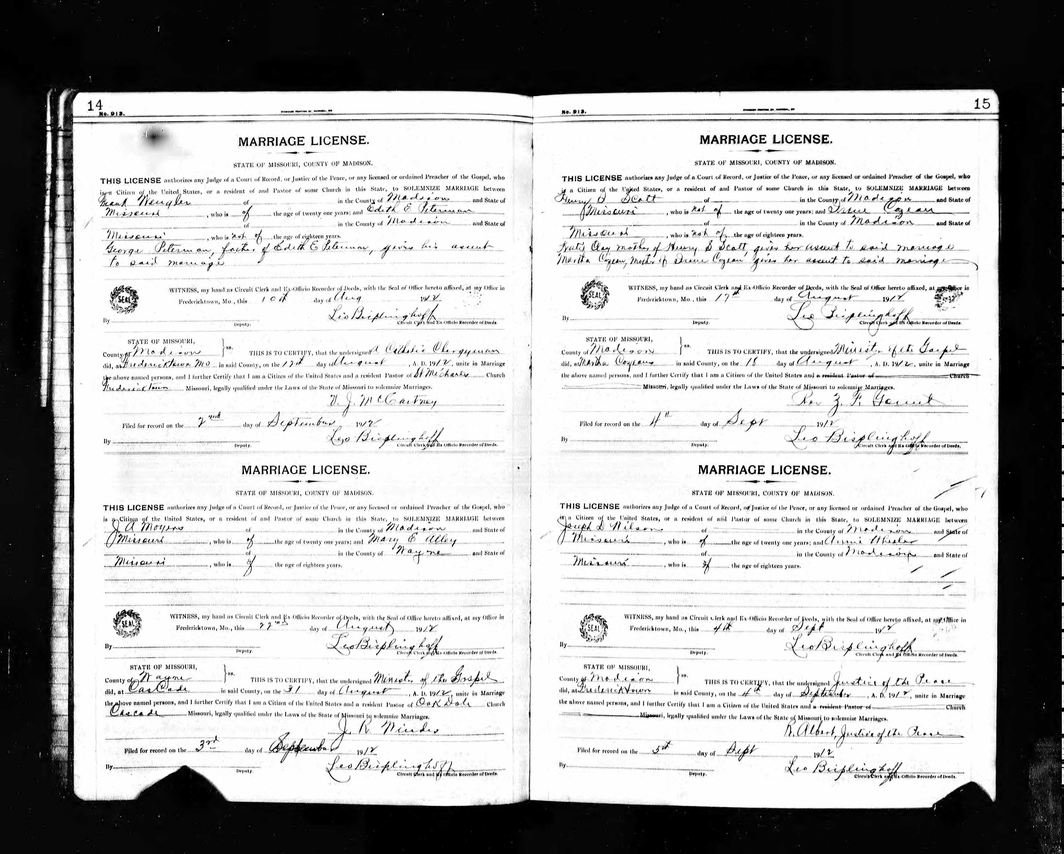Missouri Marriage Record, J. A. Moyers and Mary E. Alley