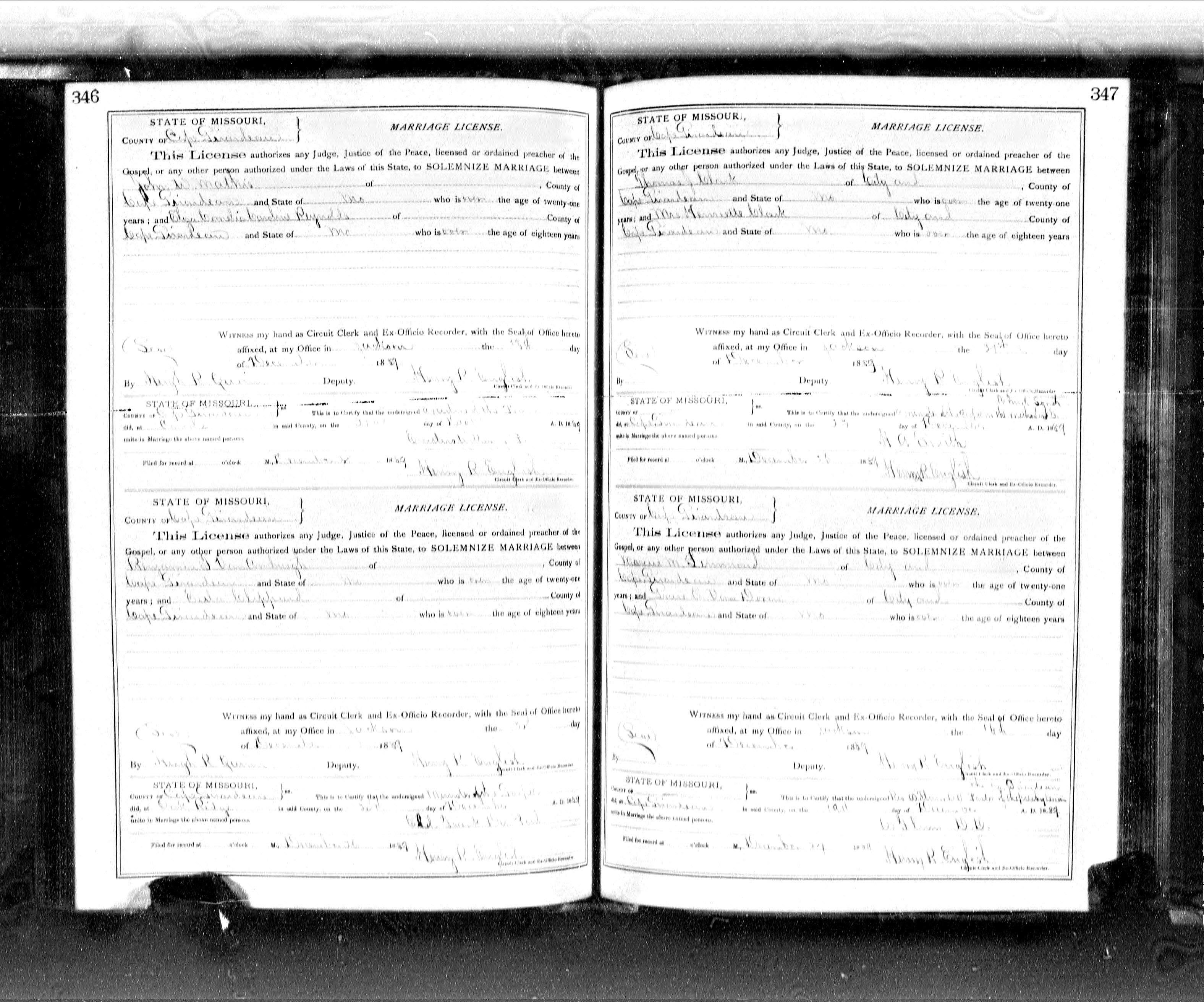 Missouri Marriage Record, John W. Mathis and Eliza Cornelia Caroline Reynolds