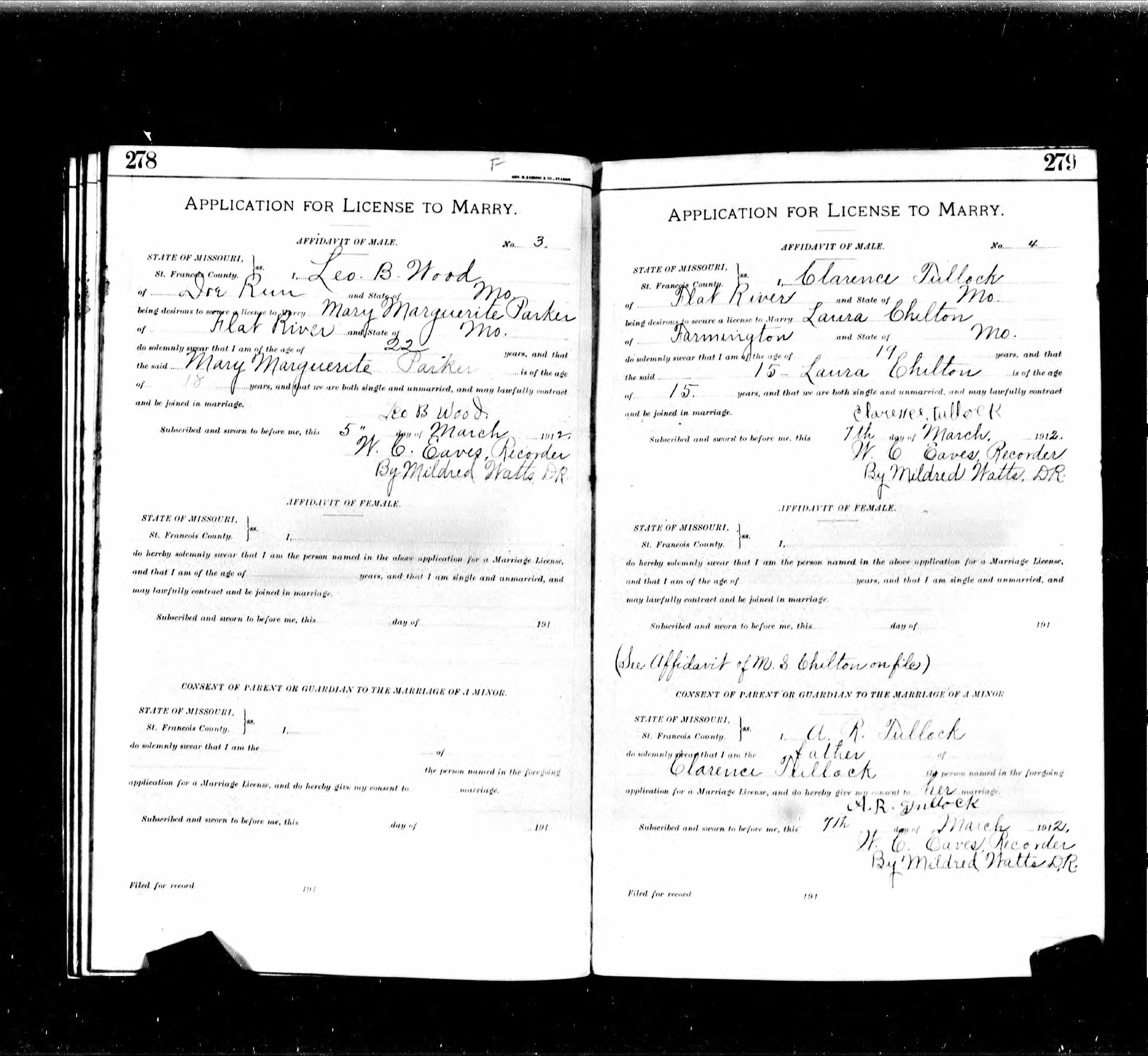 Missouri Marriage Application, Leo B. Wood and Mary Marguerite Parker