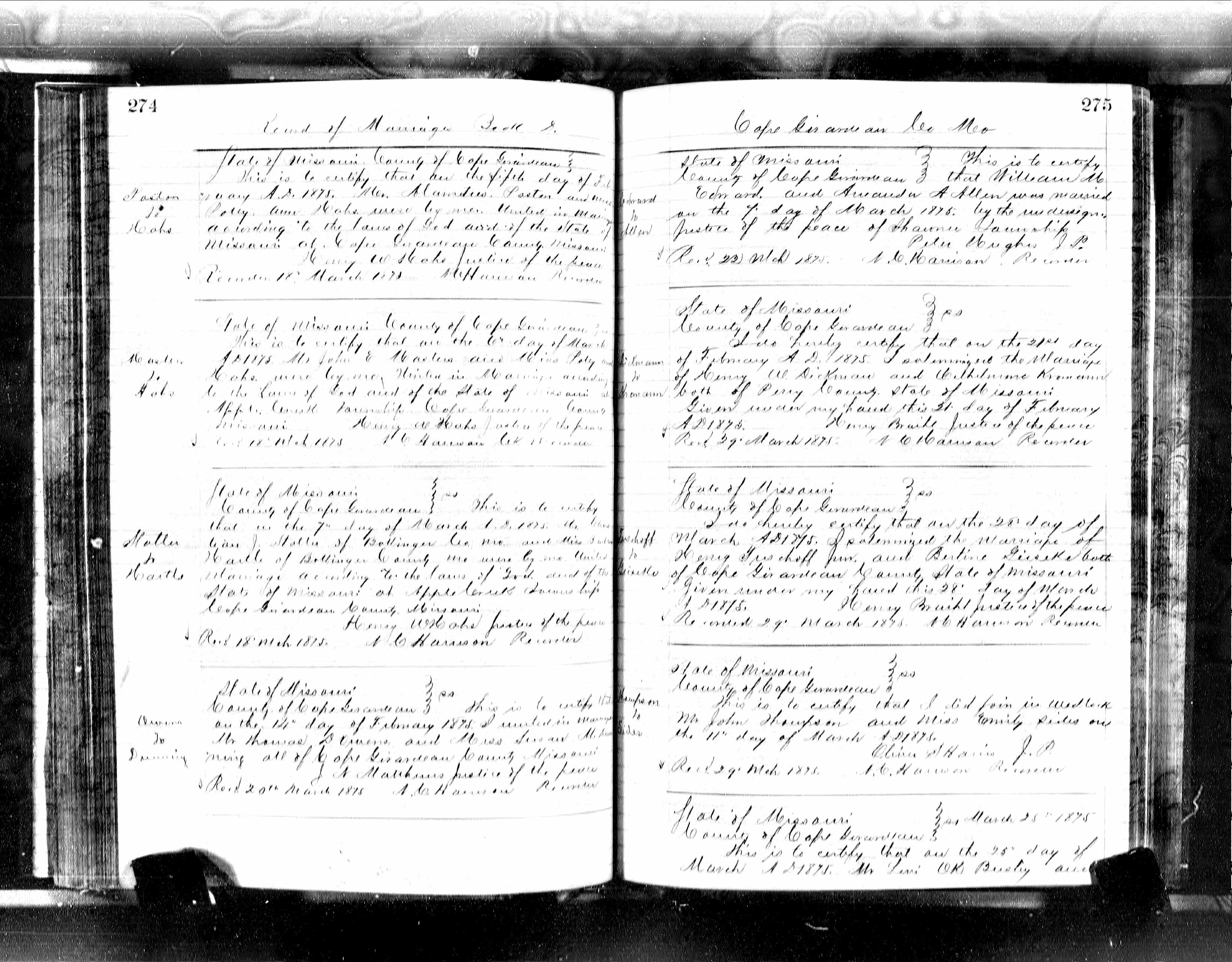 Missouri Marriage Record, John Thompson and Emily Sides
