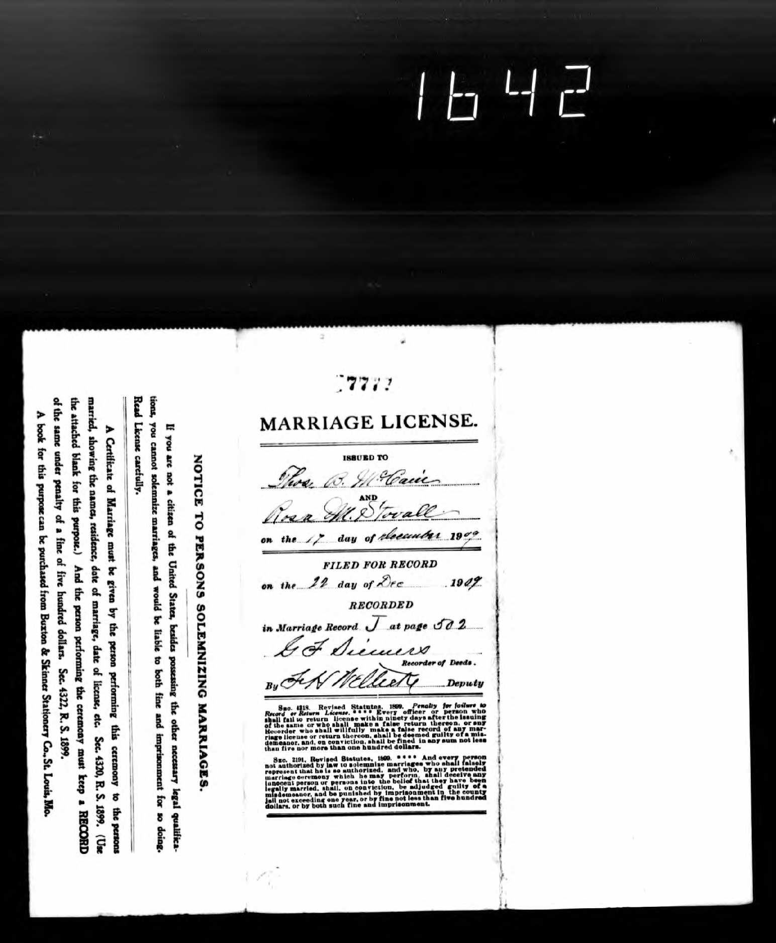 Missouri Marriage Record, Thomas B. McCain & Rosa M. Stovall