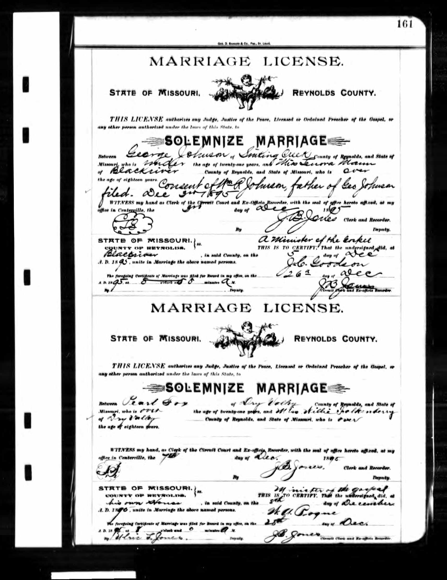 Missouri Marriage Record, George Johnson and Lenora Mann