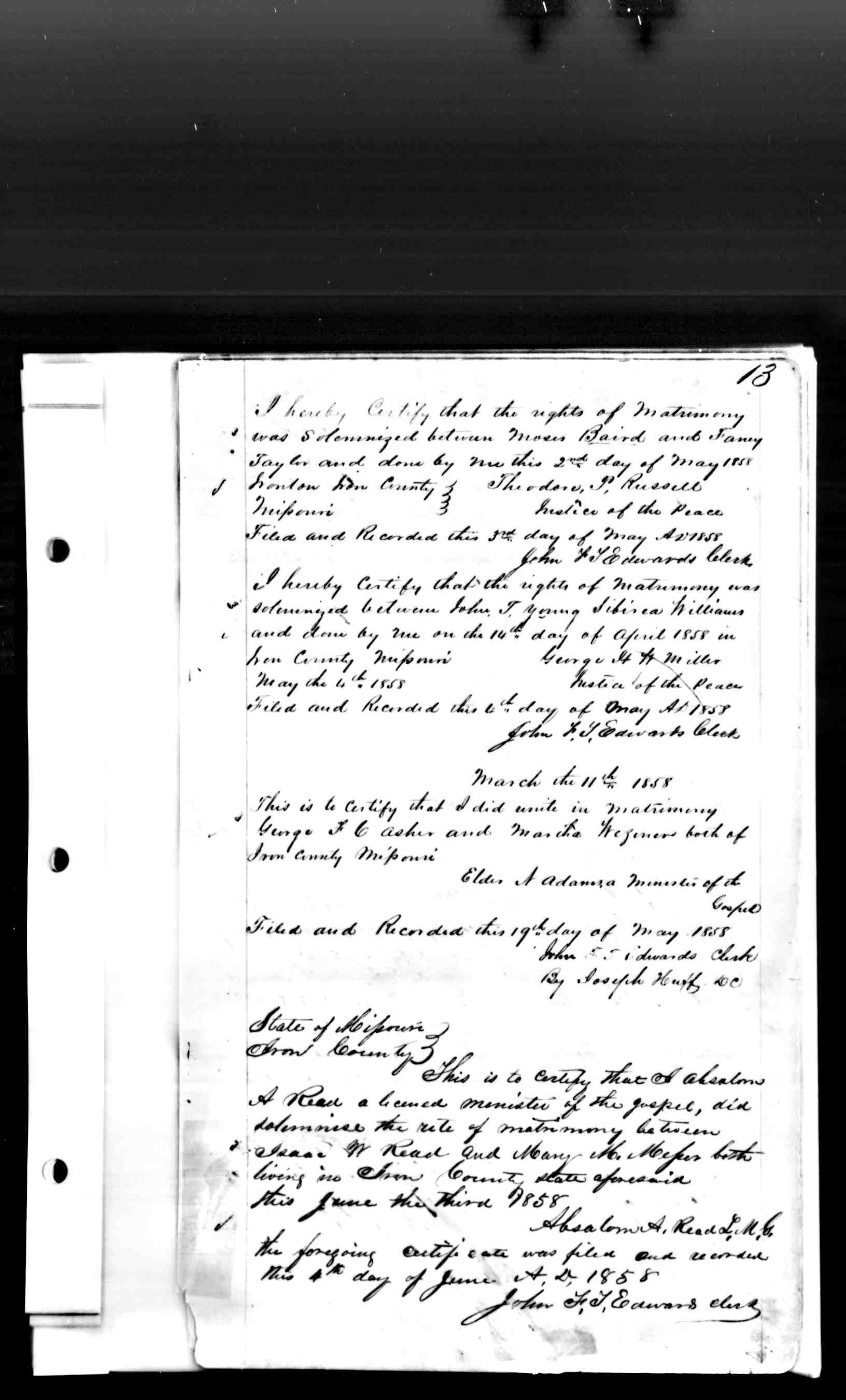 Missouri Marriage Record, John T. Young and Siberia William