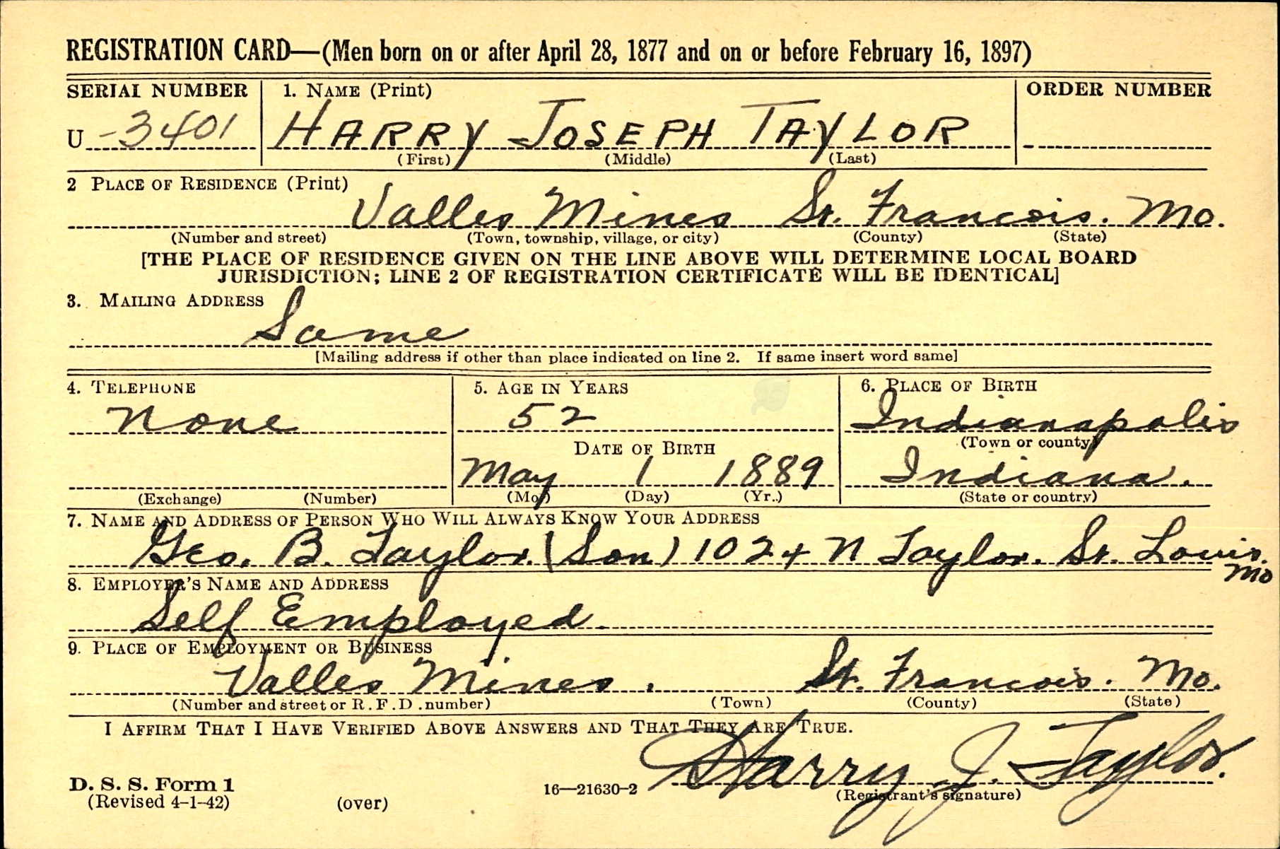 WWII Draft Registration, Harry Joseph Taylor