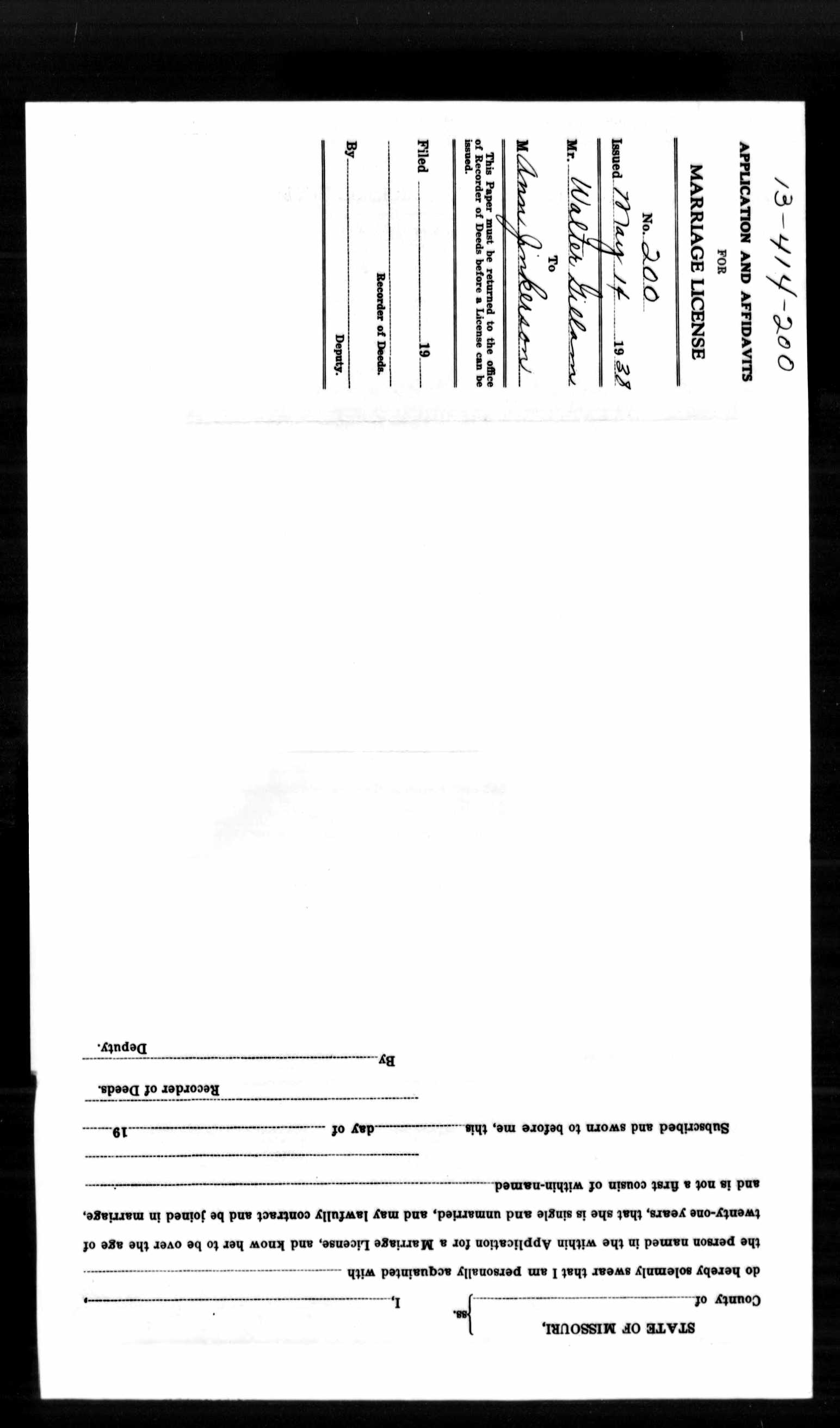 Missouri Marriage Application, Walter Gillam and Ann Jinkerson