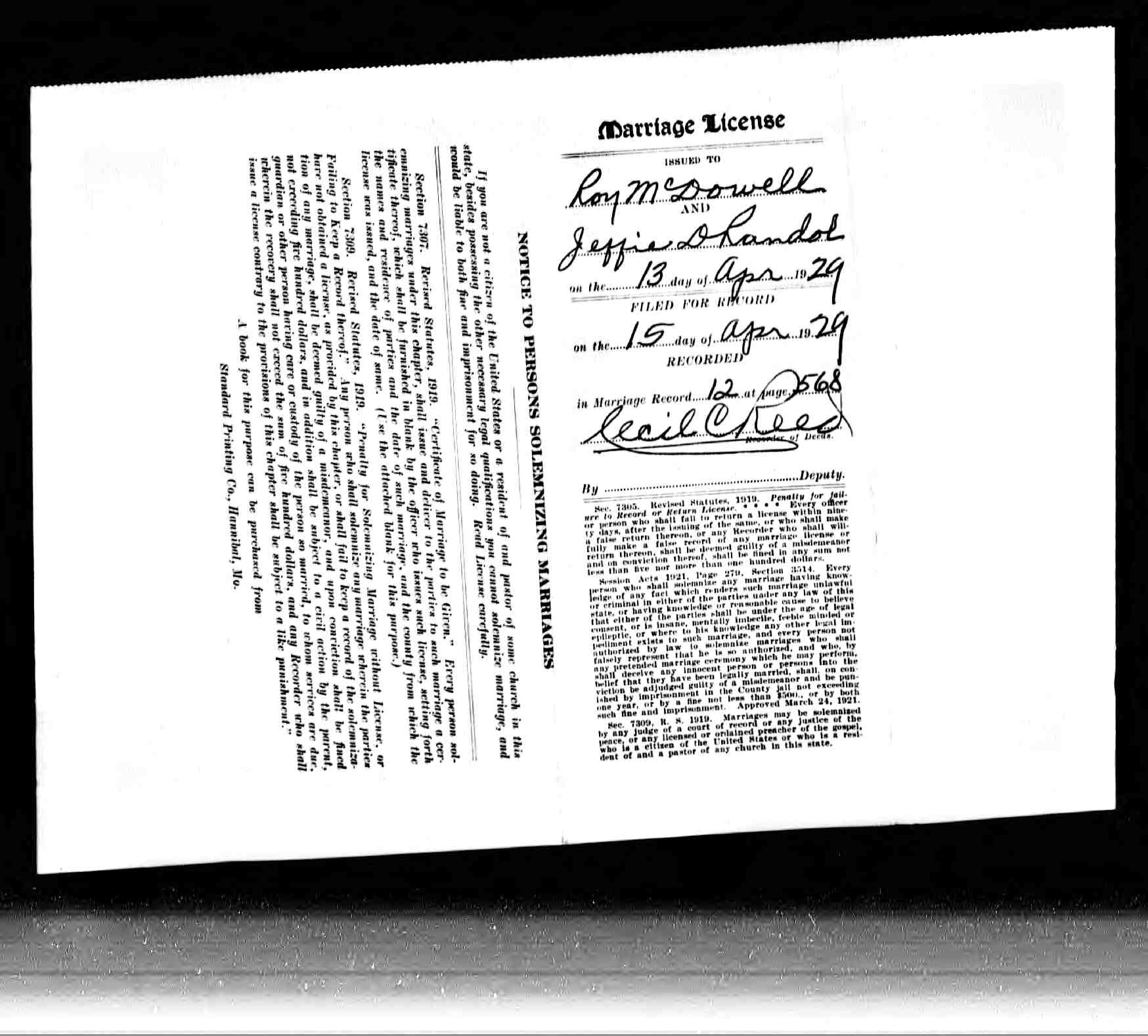 Missouri Marriage Record, Roy McDowell and Jeffie D. Randol