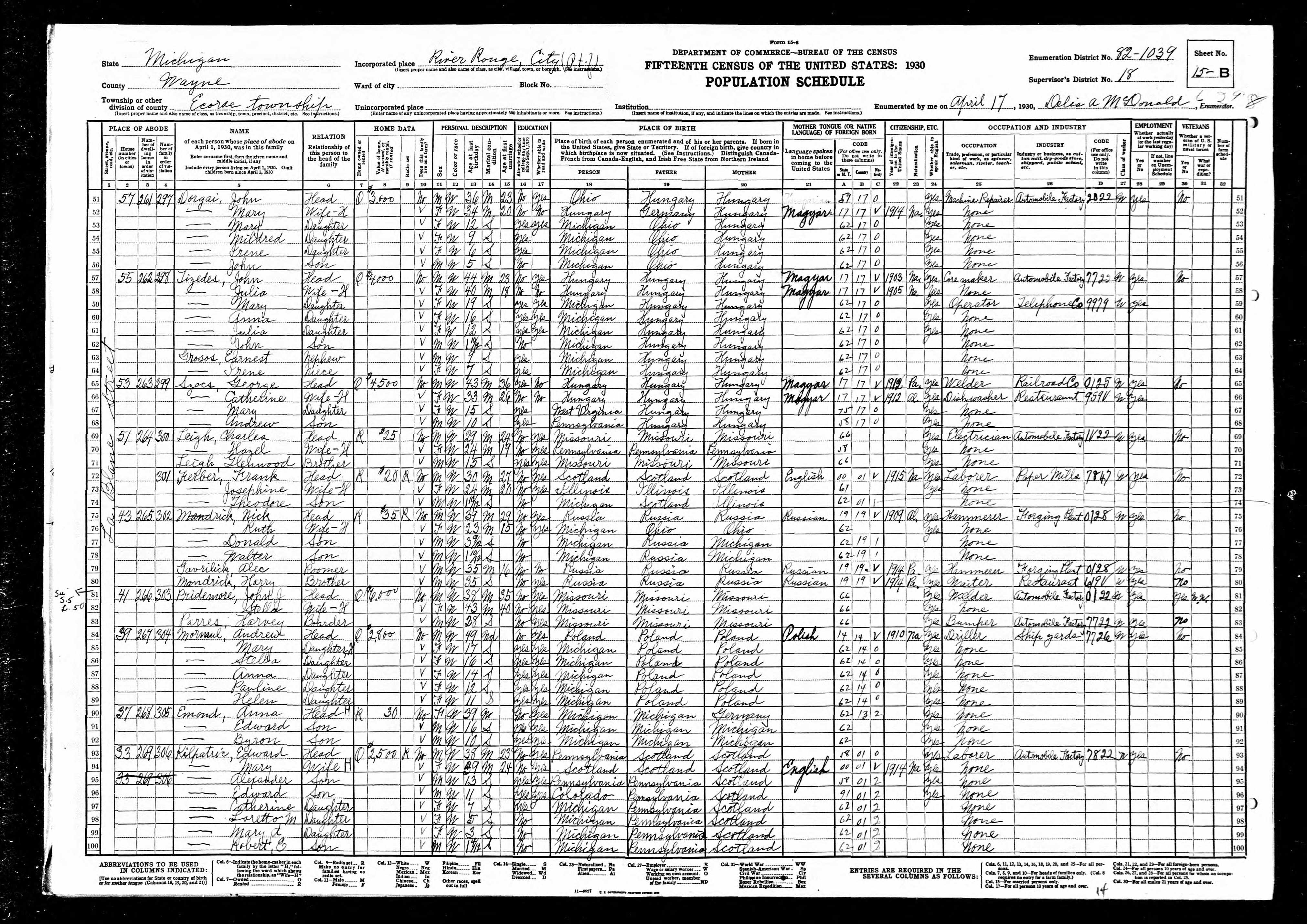 Michigan, Enumeration District 82-1039, Supervisor's District 18, Sheet 15B, Lines 81-82