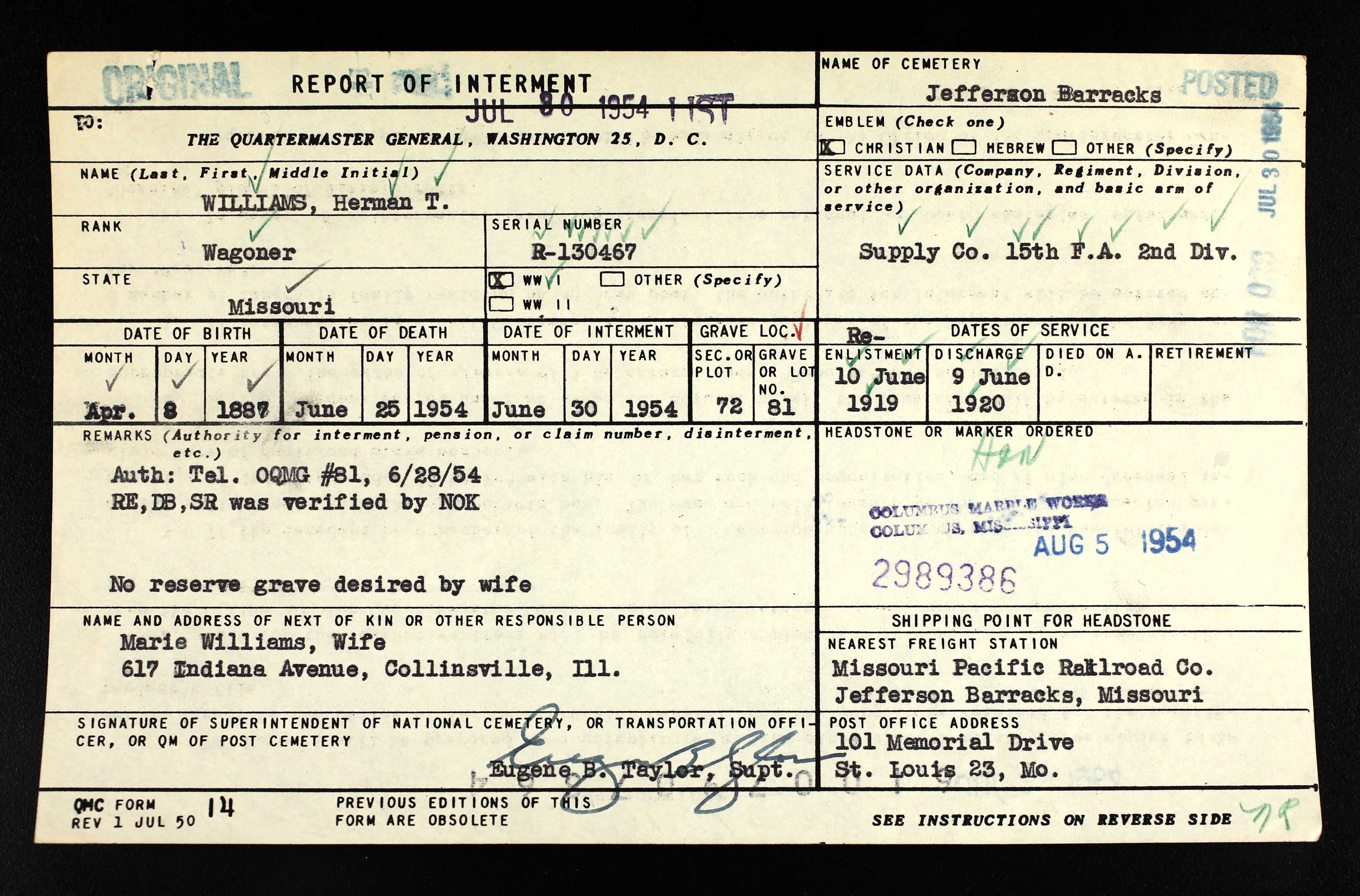 U.S. National Cemetery Interment Control Record, Herman T. Williams