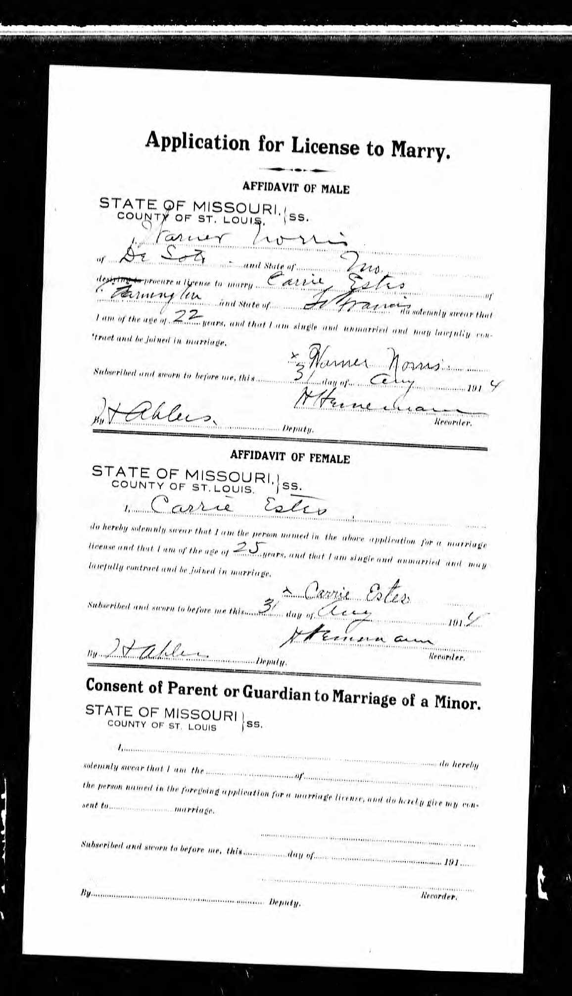 Missouri Marriage Application, Warner Norris and Carrie Estes