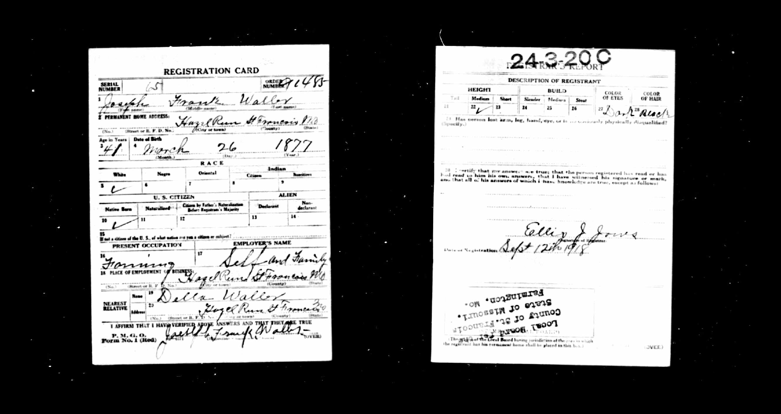 WWI Draft Registration, Joseph Frank Waller