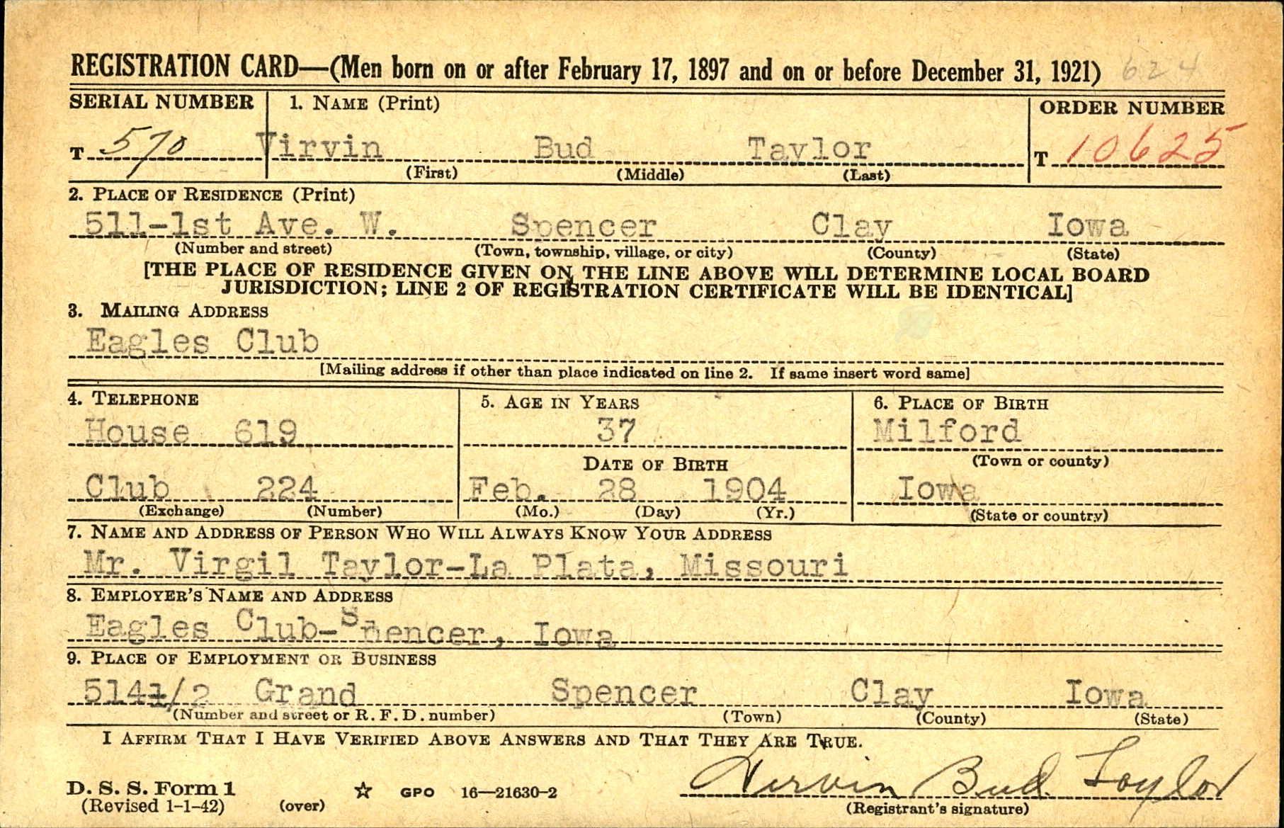 WWII Draft Registration, Virvin Bud Taylor